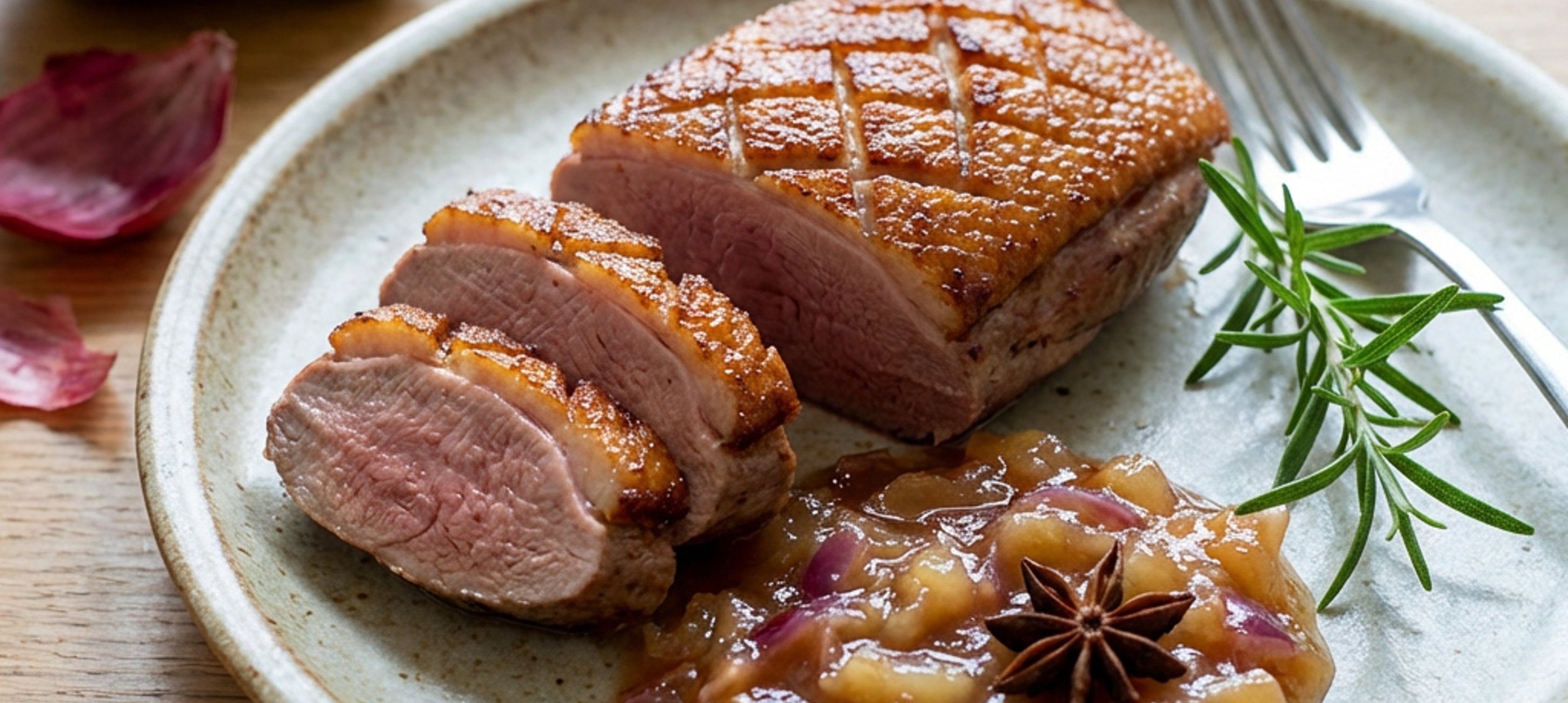 Maso podáváme s hruškovým chutney, nakrájené na tenké plátky - dle chuti ještě na talíři osolíme a opepříme.