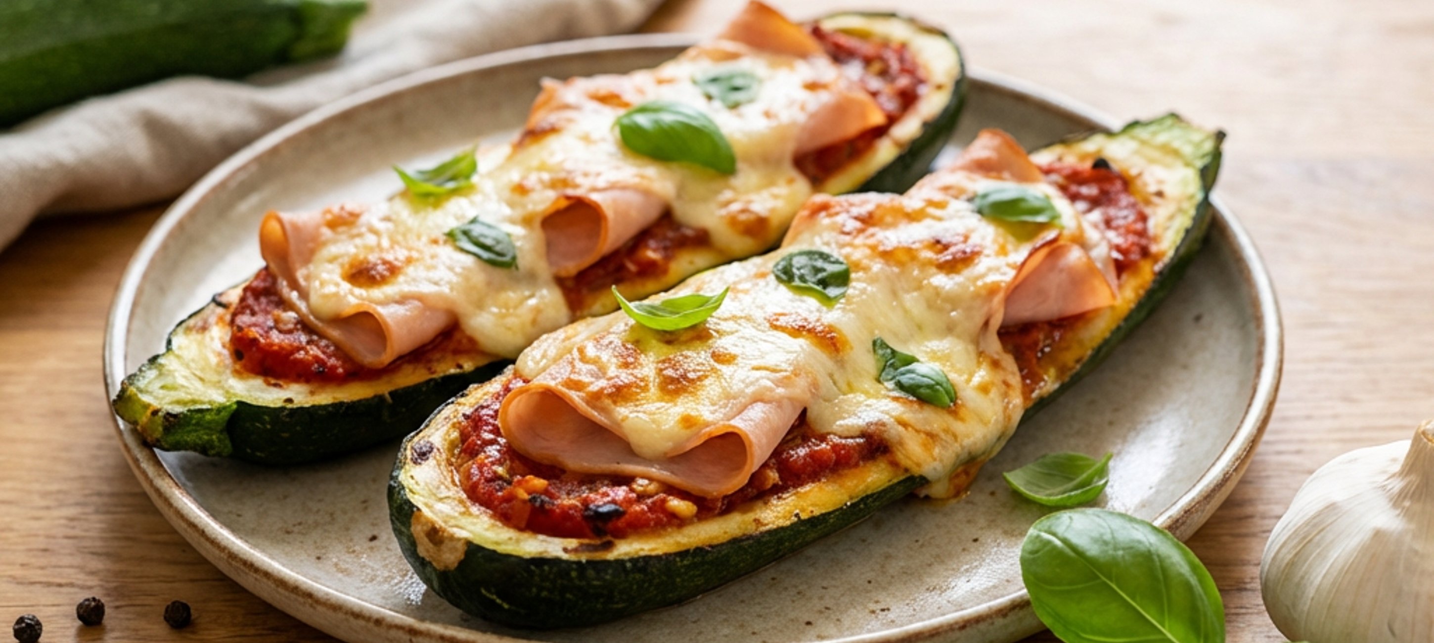 - 5Vytáhněte cukety z trouby, potřete je rajčatovou směsí, poklaďte plátky šunky a posypejte nastrouhanou mozzarellou.