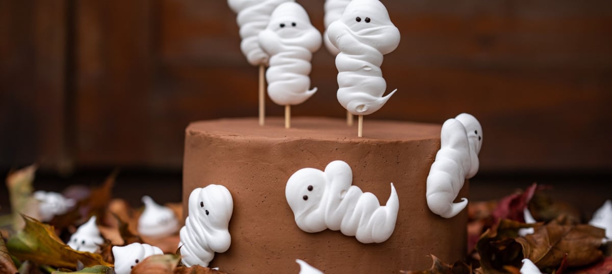 - 2Spread the cake base with chocolate cream and arrange the meringue ghosts on top (stick them with a little cream). Insert 'floating' ghosts into the cake.