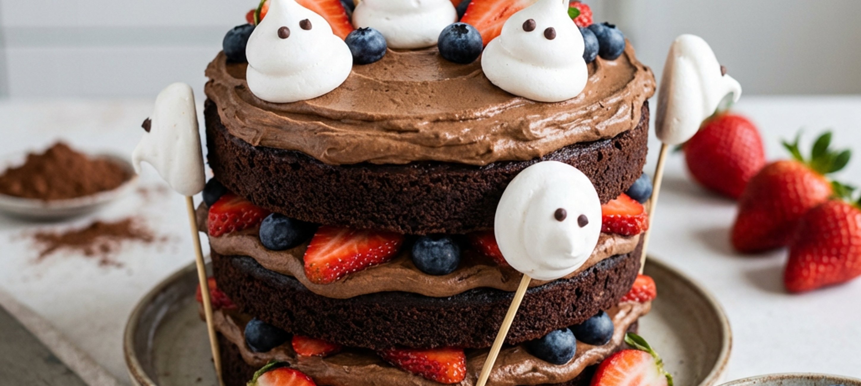 - 2Korpus pomažte čokoládovým krémem a na něj naskládejte pusinkové duchy (přilepte trochou krému). „Levitující“ duchy zapíchněte do dortu.