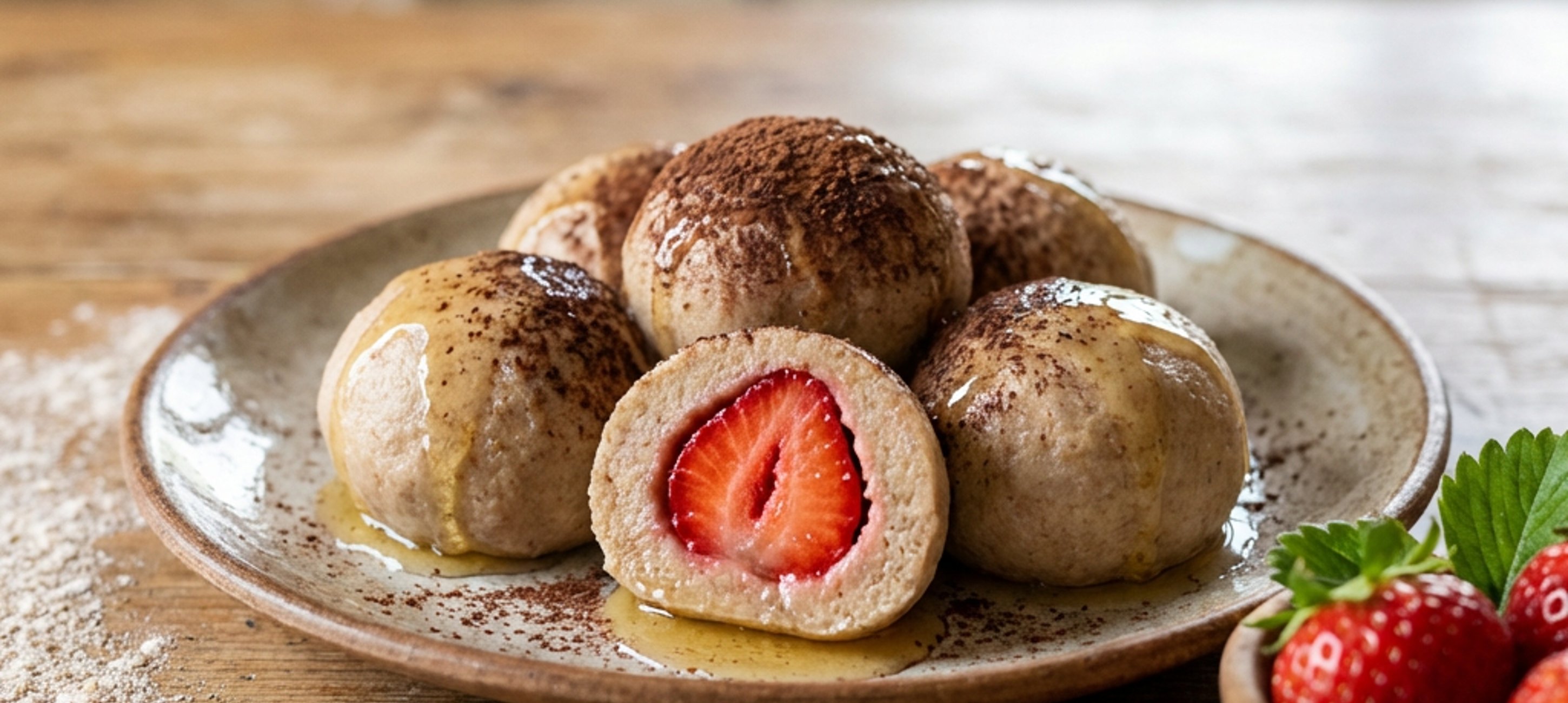 - 6Hotové jahodové knedlíky rozdělte do 4 talířů, polijte kokosovým olejem s medem a podávejte posypané skořicí nebo holandským kakaem.