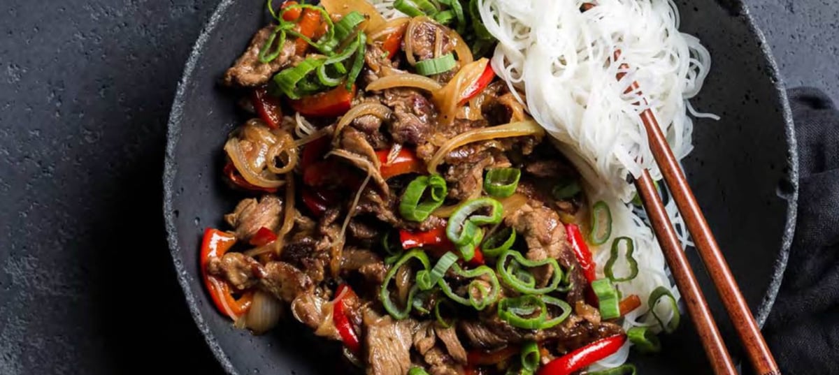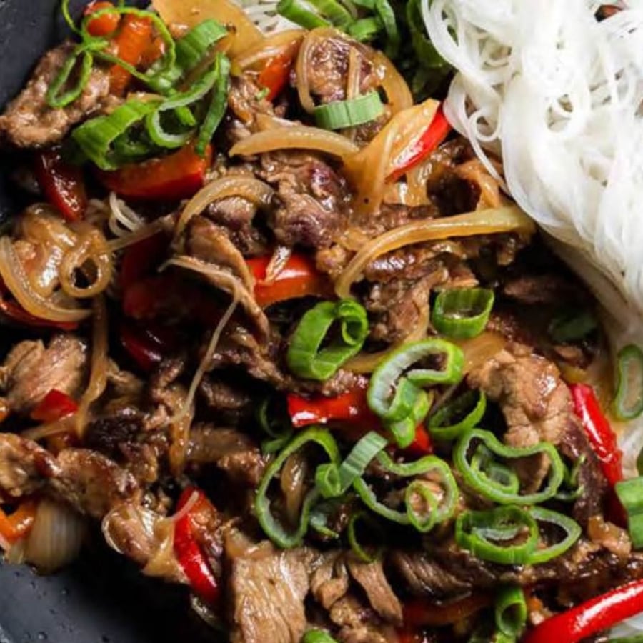 - 5Divide the finished meat mixture from the pan into 2 plates, sprinkle with chopped spring onion, and serve with the cooked noodles.