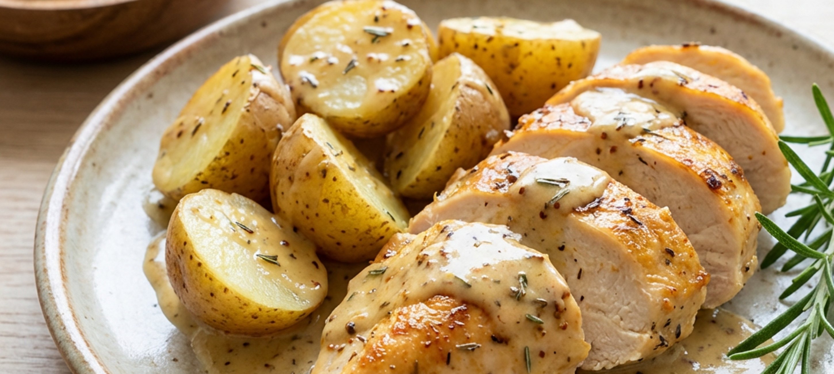 - 2Kuřecí prsa očistěte, osolte a opepřete. Brambory i se slupkou důkladně očistěte kartáčkem pod tekoucí vodou, rozkrájejte je na poloviny a naskládejte do připraveného pekáče. Poté brambory osolte, opepřete a pokapejte 2 lžícemi olivového oleje a vše důkladně promíchejte. Navrch následně položte kuřecí prsa. Nakonec si v misce společně vyšlehejte smetanu, hořčici, tymián, rozmarýn, sůl a pepř a výslednou směsí zalijte celý obsah pekáče