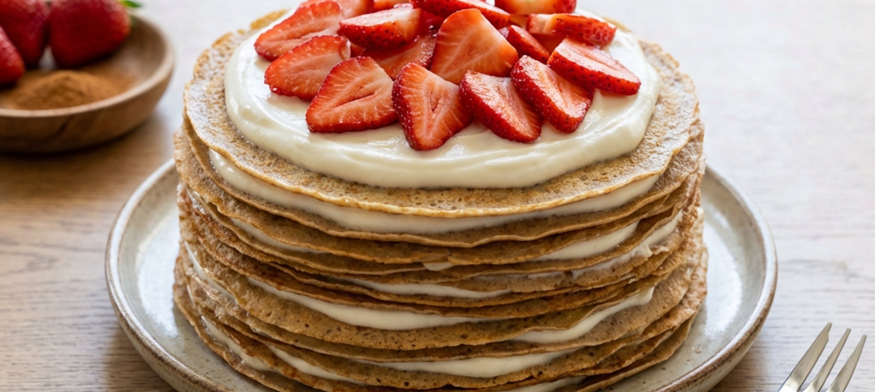 - 2V misce vyšlehejte tvaroh s medem a vanilkovým extraktem a výsledný krém dejte vychladit do lednice. Následně si přichystejte těsto na palačinky a nepřilnavou pánev. Pánev udržujte při středním stupni ohřevu a z připraveného těsta upečte palačinky – každou palačinku stačí péct 1–2 minuty z každé strany. Množství těsta by mělo vystačit na zhruba 12 palačinek o průměru 25 cm.