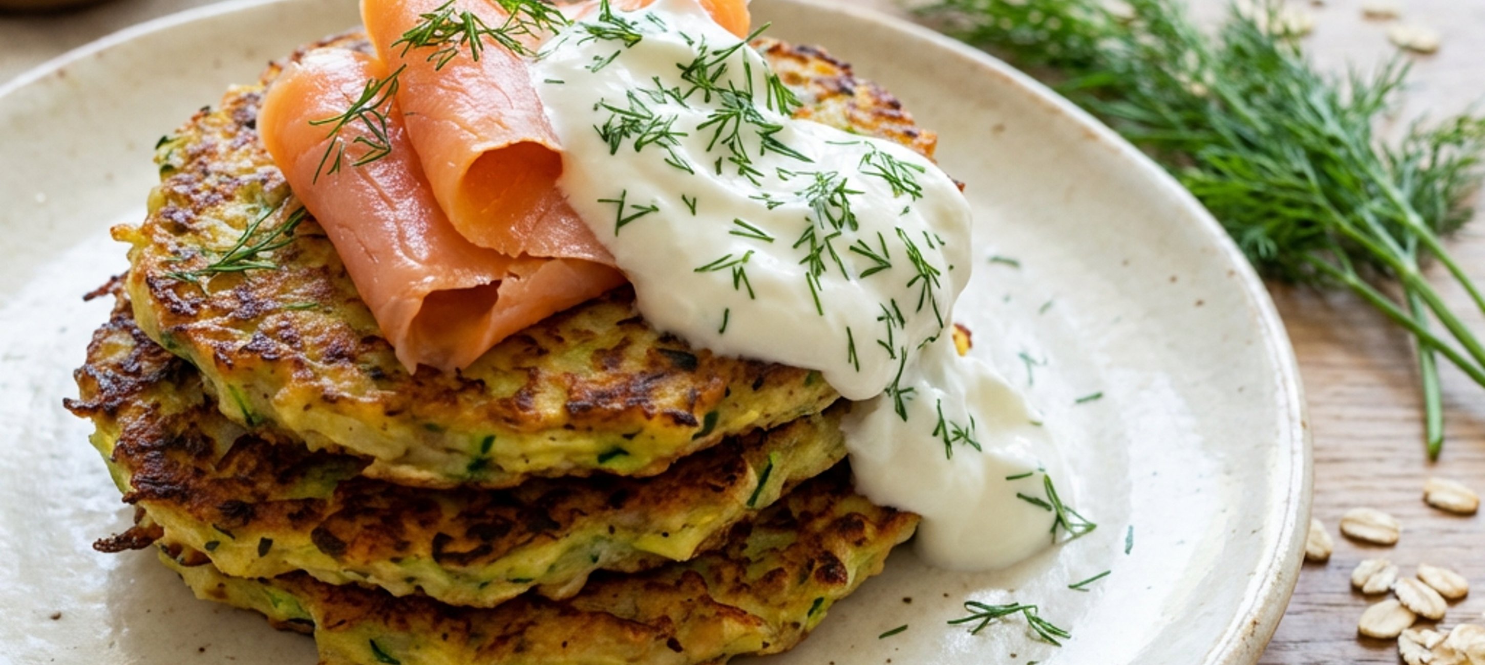 - 4Hotové bramboráky podávejte s připraveným dipem a plátky uzeného lososa.