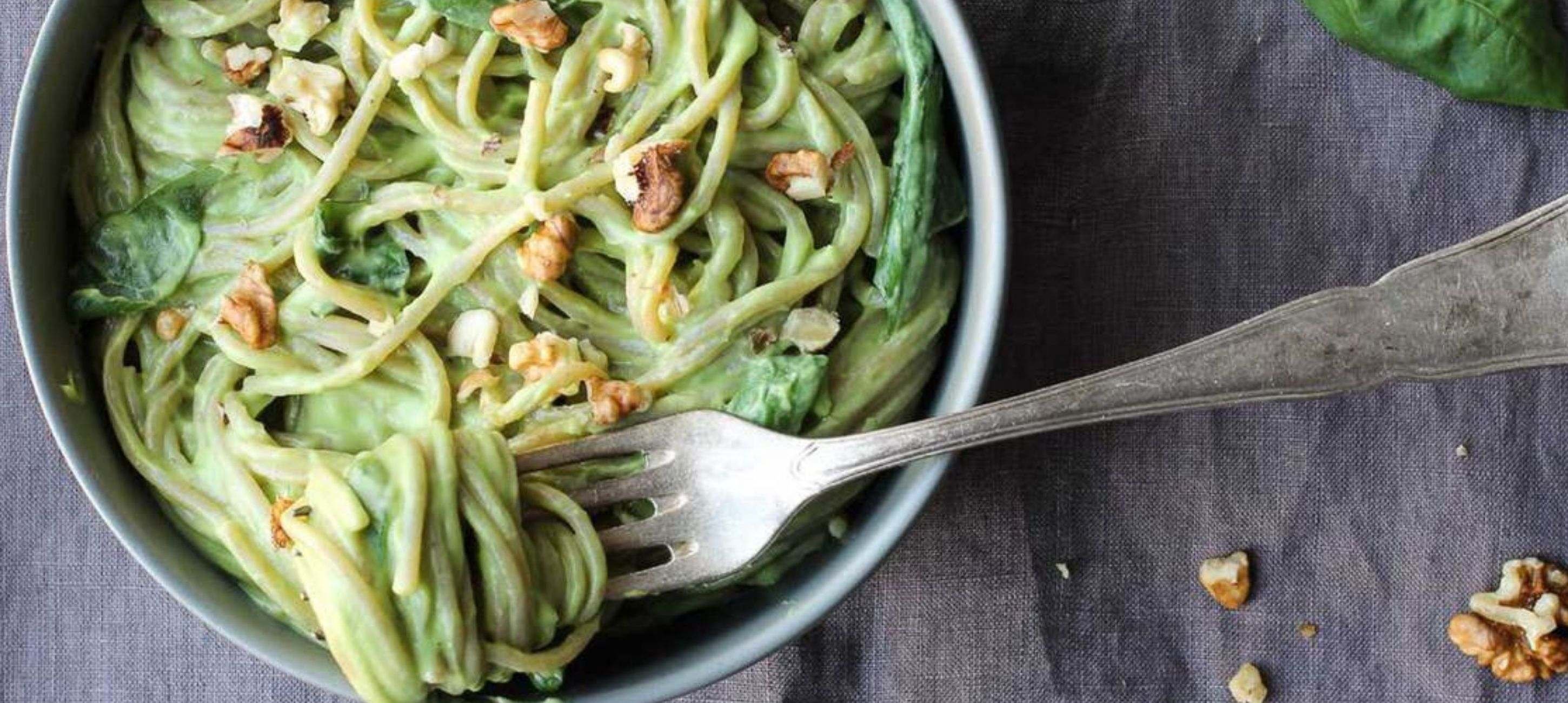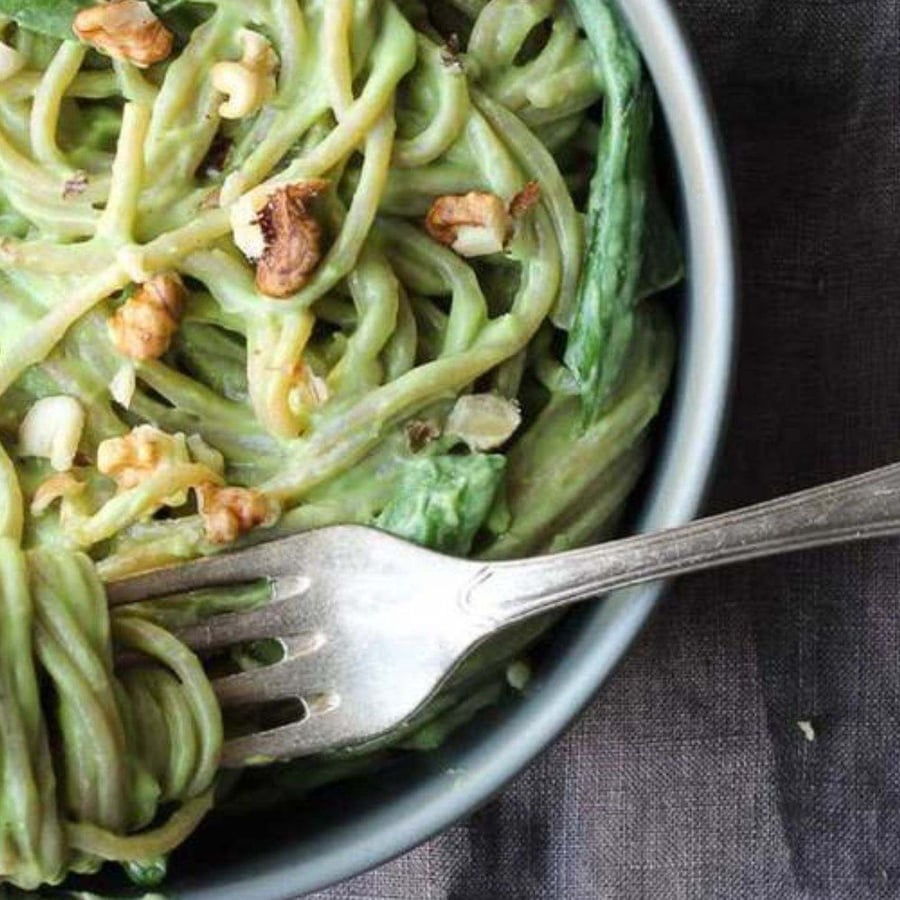 In the meantime, while the spaghetti is cooking, prepare the sauce. Remove the skin and pit from the avocados and blend them together with olive oil, garlic, and lemon juice.