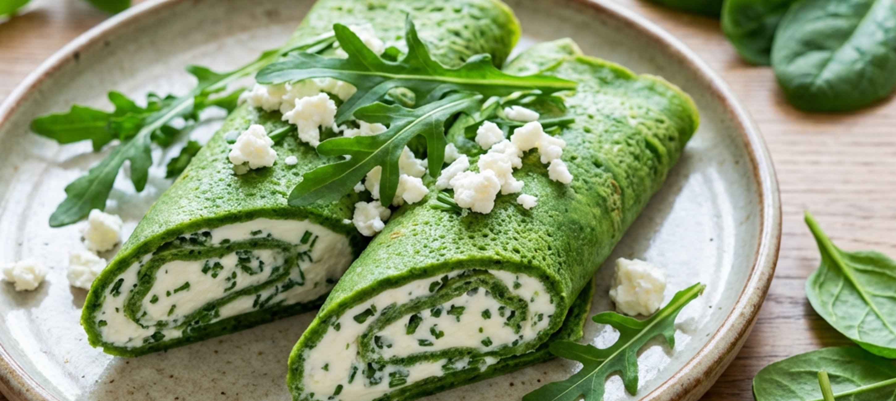 - 4Až budou palačinky hotové, vyndejte z lednice připravenou směs. Celou plochu každé palačinky potřete připravenou směsí a na každou přidejte nahrubo nadrobený balkánský sýr a rukolu.
