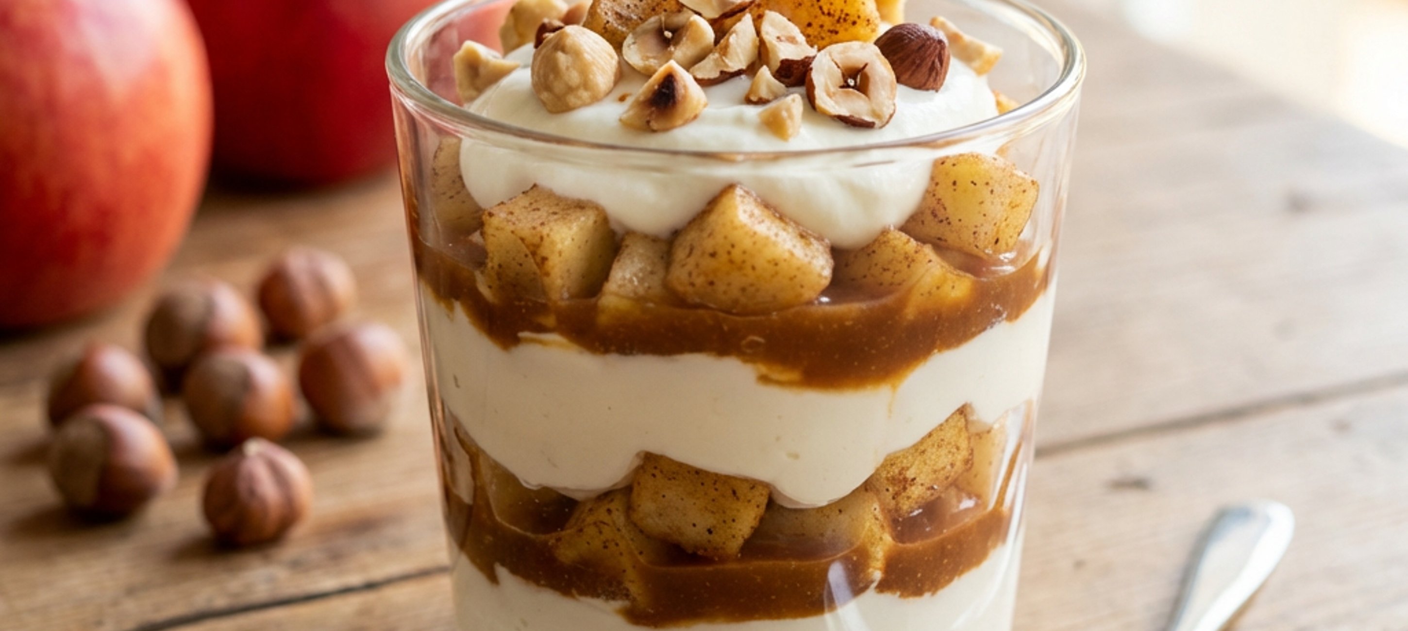 - 4Na dno skleničky vložíme část krému. Na něj nasypeme drcené sušenky, nalijeme datlový karamel a zasypeme částí pečených jablek. Na další vrstvu použijeme zbytek krému, datlový karamel a pečená jablka. Celý dezert pak posypeme nasekanými lískovými ořechy.