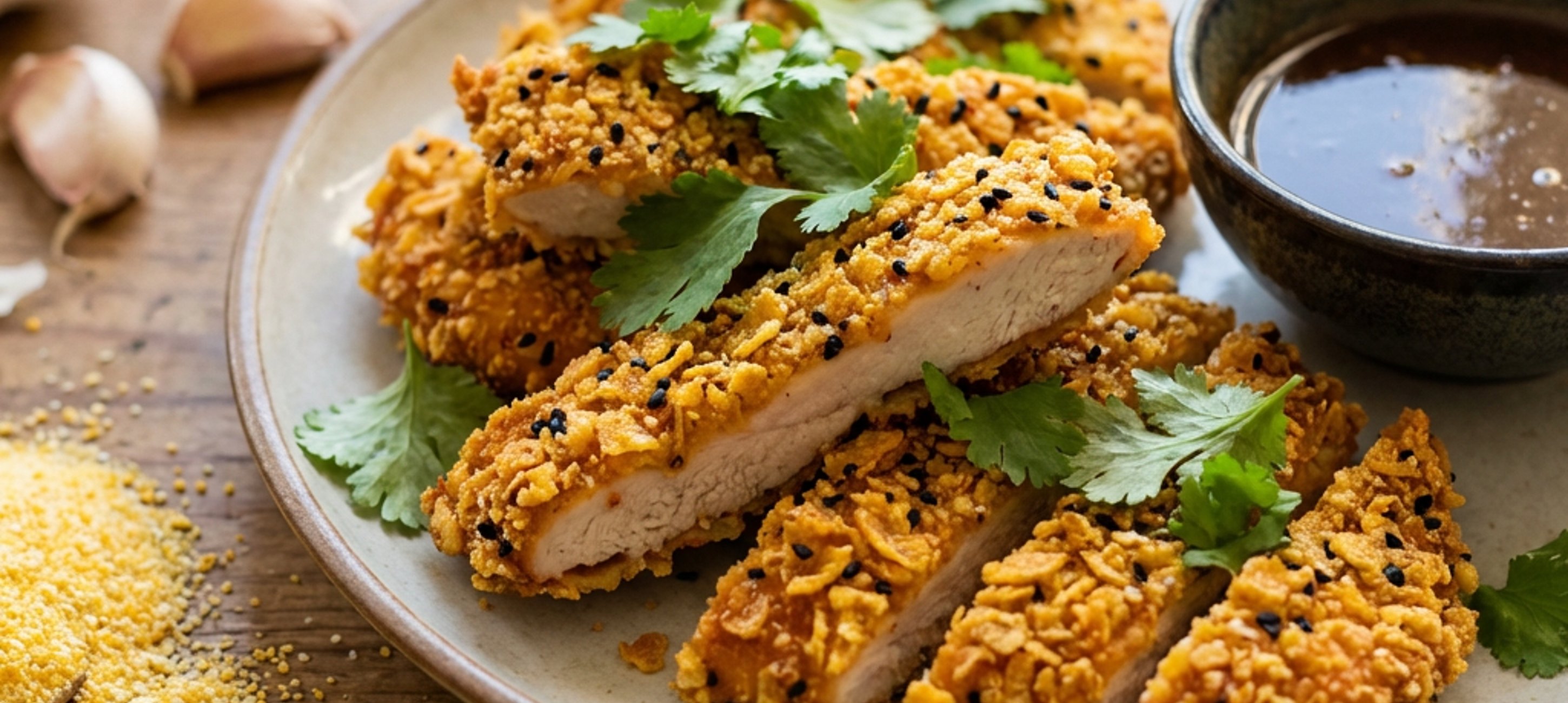 - 4Připravené kuřecí řízky následně potřete směsí z miso pasty a poté obalte ve směsi z kukuřičné strouhanky. Hotový řízek položte na připravený plech a postup opakujte, dokud nezpracujete zbytek masa.
