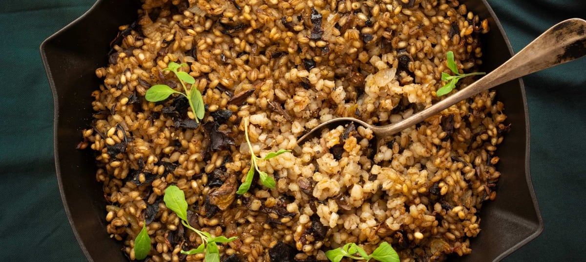 - 3Heat a pan with butter and olive oil over medium heat and finely chop the mushrooms in the meantime. Once the oil and butter are hot, add the onion to the pan and sauté for 8–10 minutes over medium heat. Then add the chopped mushrooms, caraway seeds, and garlic, and sauté everything for another 3–4 minutes over medium heat. After the specified time, add the cooked barley and marjoram and continue sautéing over medium heat (5–6 minutes).