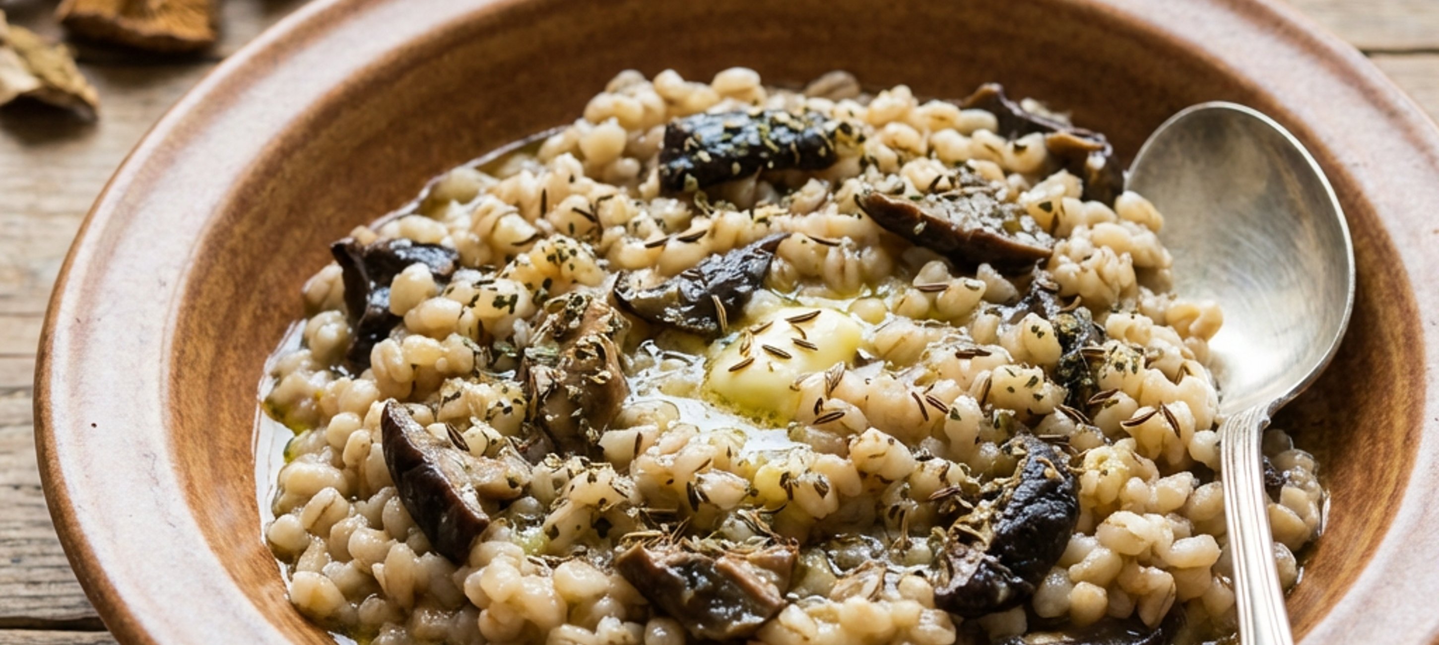 - 3Na středním plameni rozpalte pánev s máslem a olivovým olejem a mezitím si najemno nakrájejte houby. Jakmile bude olej s máslem rozpálený, vložte do pánve cibuli a restujte 8–10 minut na středním plameni. Následně přidejte nakrájené houby, kmín a česnek a vše restujte další 3–4 minuty na středním plameni. Po uplynutí uvedeného času přidejte uvařené kroupy a majoránku a dále restujte na středním plameni (5–6 minut).