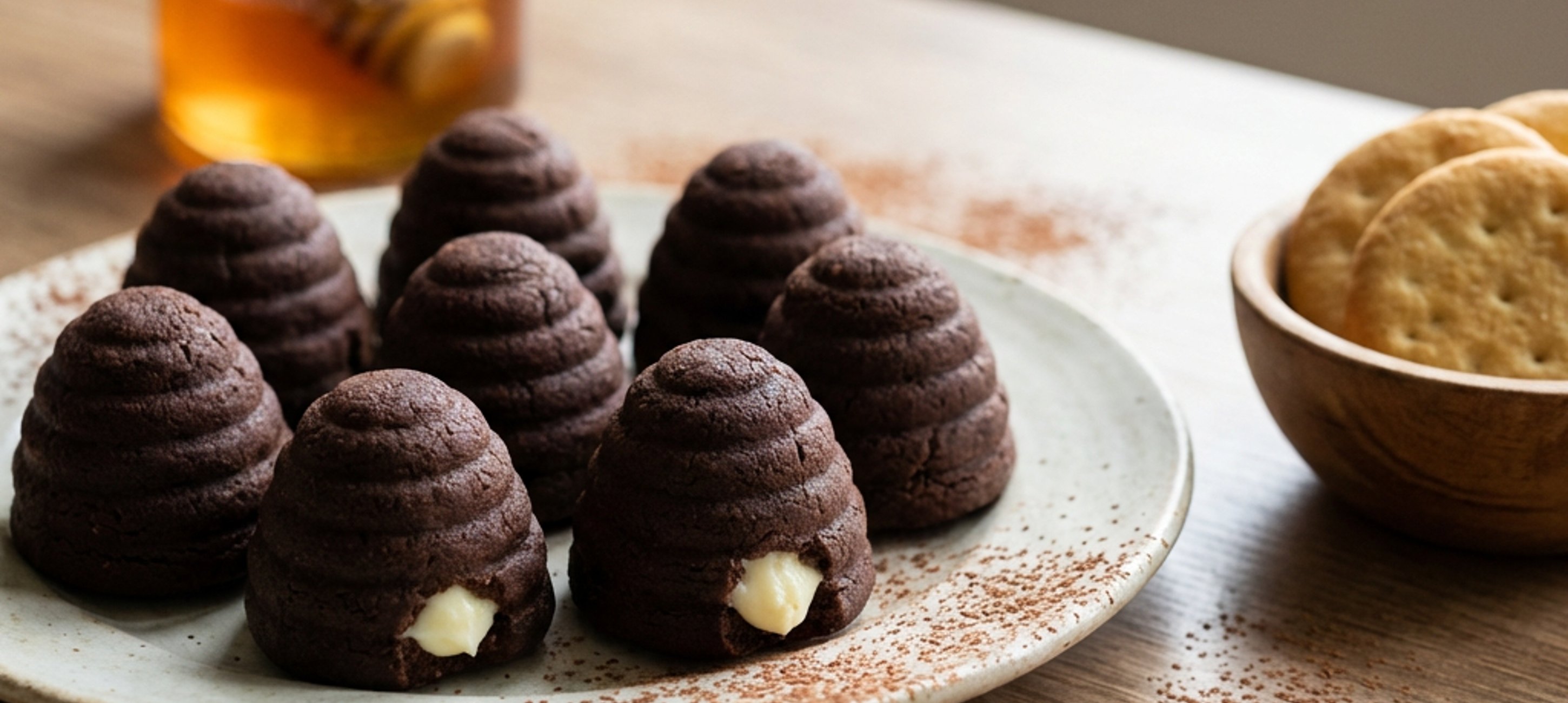 - 2Po uplynutí uvedeného času si v menší misce smíchejte smetanový sýr, 10 g medu a vanilkový extrakt. Těsto vyjměte z lednice a nachystejte si hotovou náplň ze smetanového sýru a zbylé piškoty. Těsto vtlačte do forem na vosí hnízda, pomocí úzkého konce vařečky vytvořte do těsta důlek, do něj naneste náplň a přiklopte piškotem. Následně vosí hnízda vyjměte z formy. Takto pokračujte, dokud nezpracujete všechno těsto.