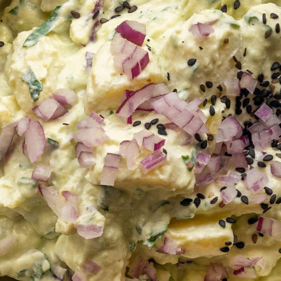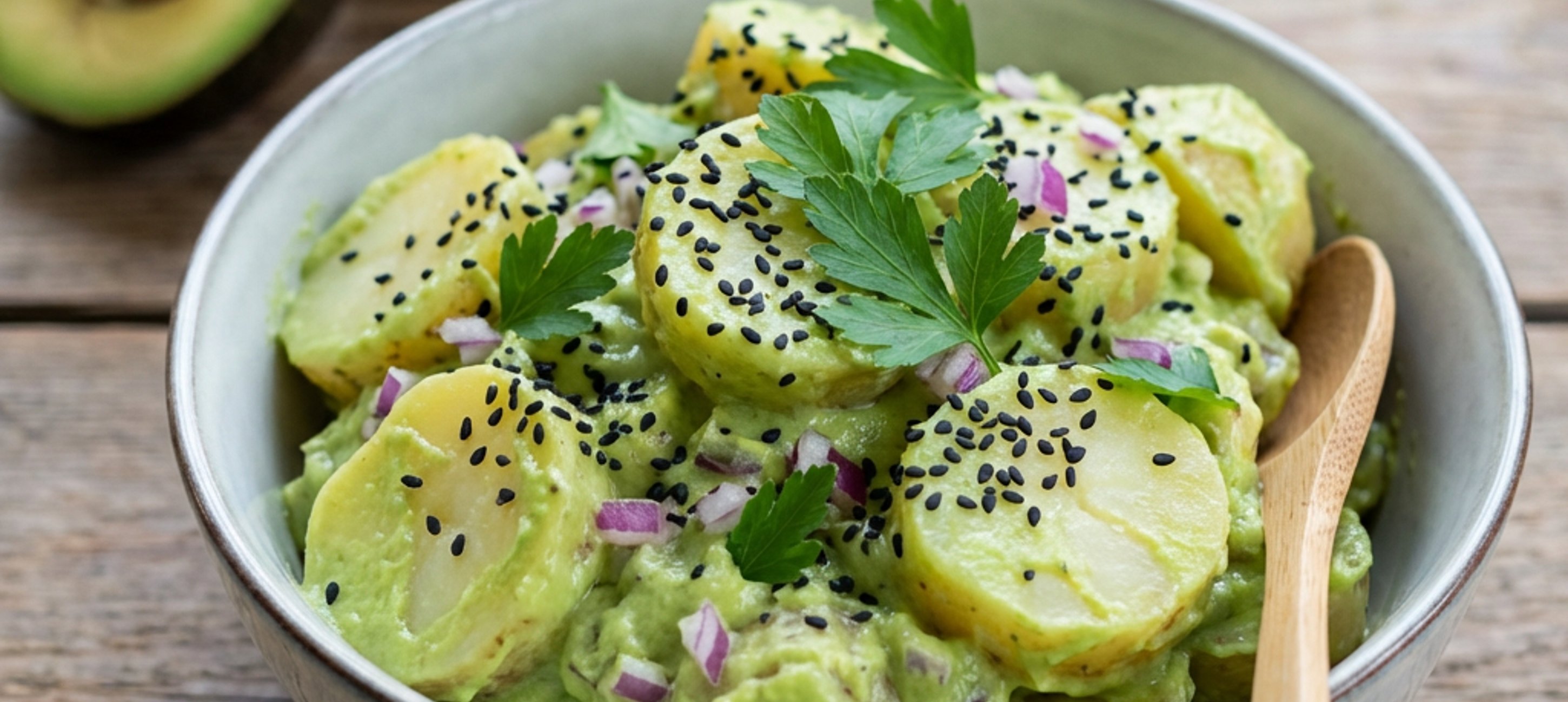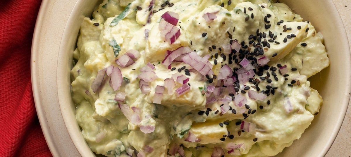 - 4Následně do větší mísy vložte avokáda, citronovou šťávu, zakysanou smetanu, sůl a pepř a vše pomocí tyčového mixéru rozmixujte do hladkého pyré. K hotovému pyré poté přidejte brambory, červenou cibuli, hladkolistou petrželovou nať a sezamová semínka a vše důkladně promíchejte.