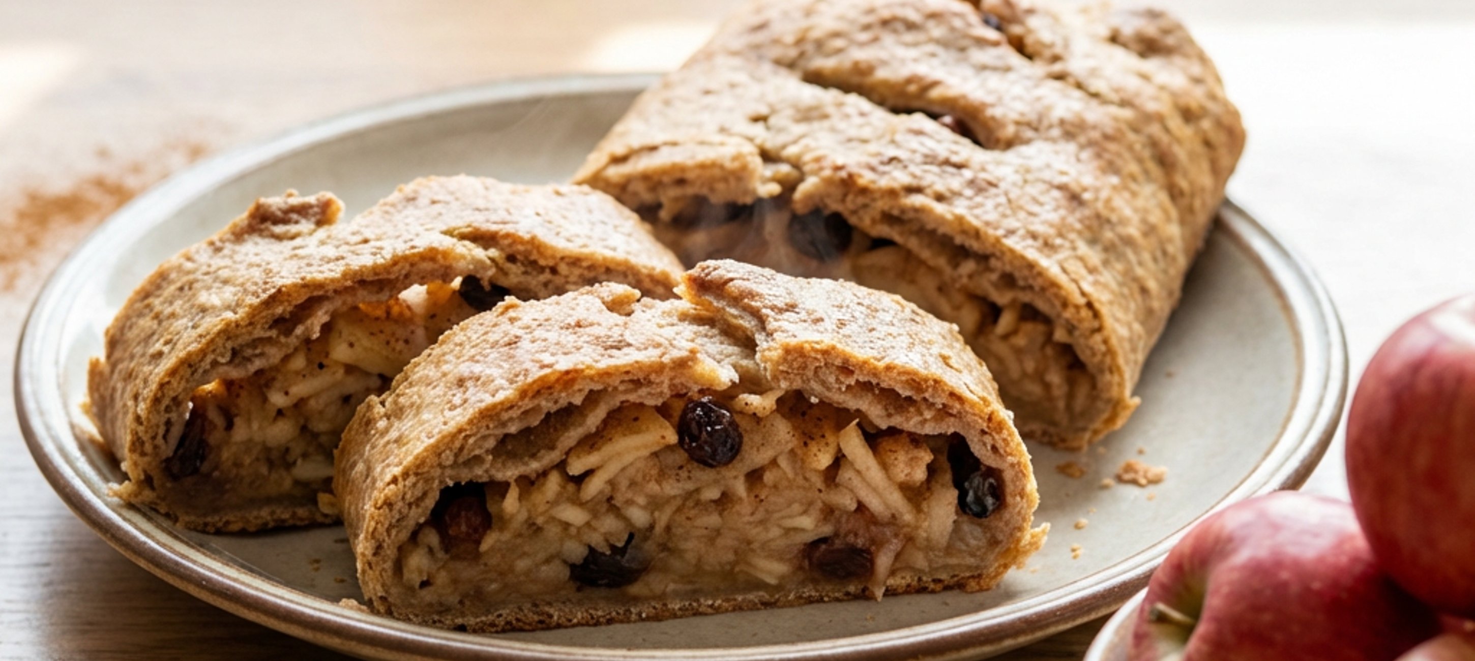 - 4Pracovní plochu si pomoučete a odleželé těsto na ni přesuňte, rozválejte na tloušťku 1 cm a na 1 jeho stranu naneste jablečnou směs. Strany těsta poté přehněte směrem dovnitř, aby jablka nevypadla, a následně je zabalte do tvaru závinu.