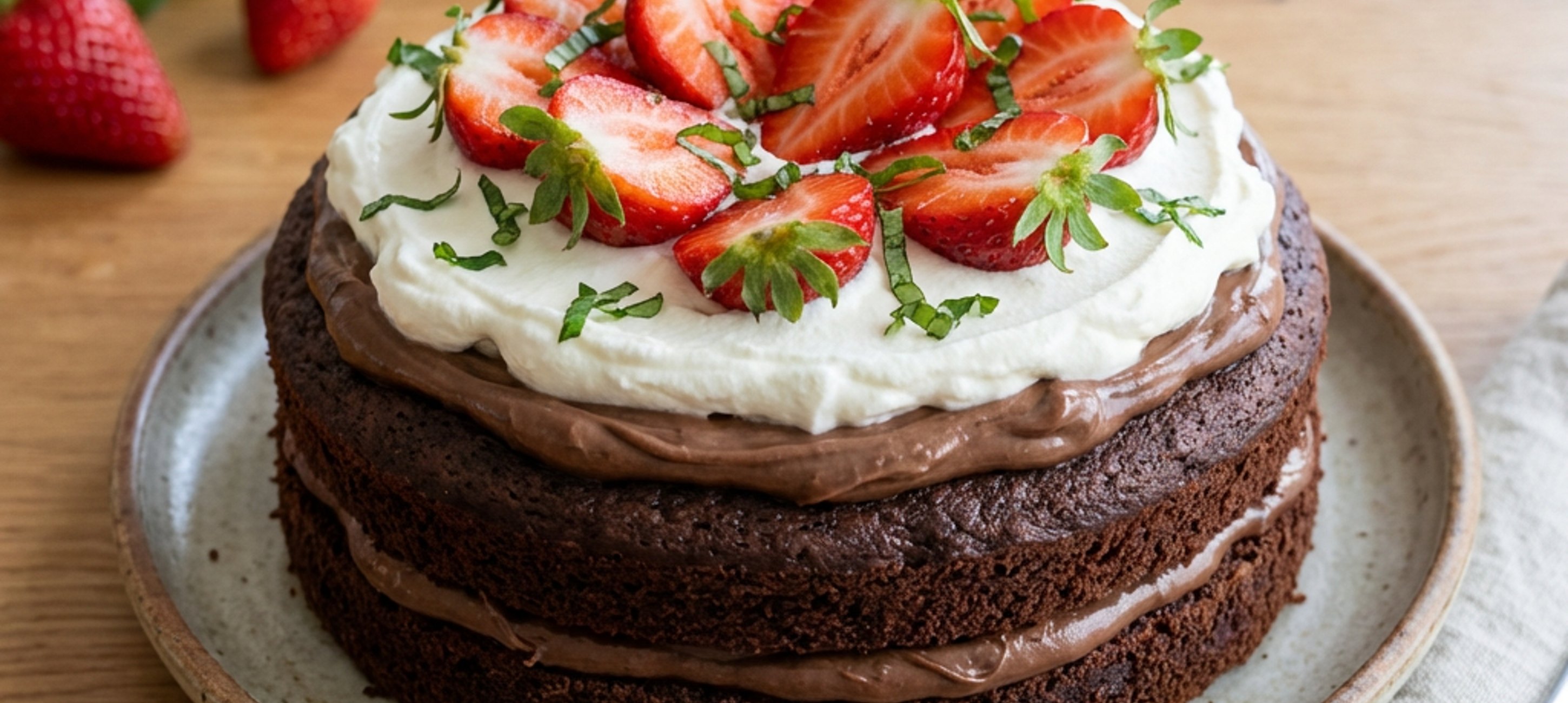 - 8Na dortový podnos položíme jeden dortový korpus, potřeme jej polovinou nutellového krému, polovinou smetanového krému a na něj poklademe jahody bez stopek a posypeme nasekanou bazalkou. Přikryjeme druhým korpusem a celý postup opakujeme. Nahoře nazdobíme jahodami se stopkami a celými lístky bazalky.