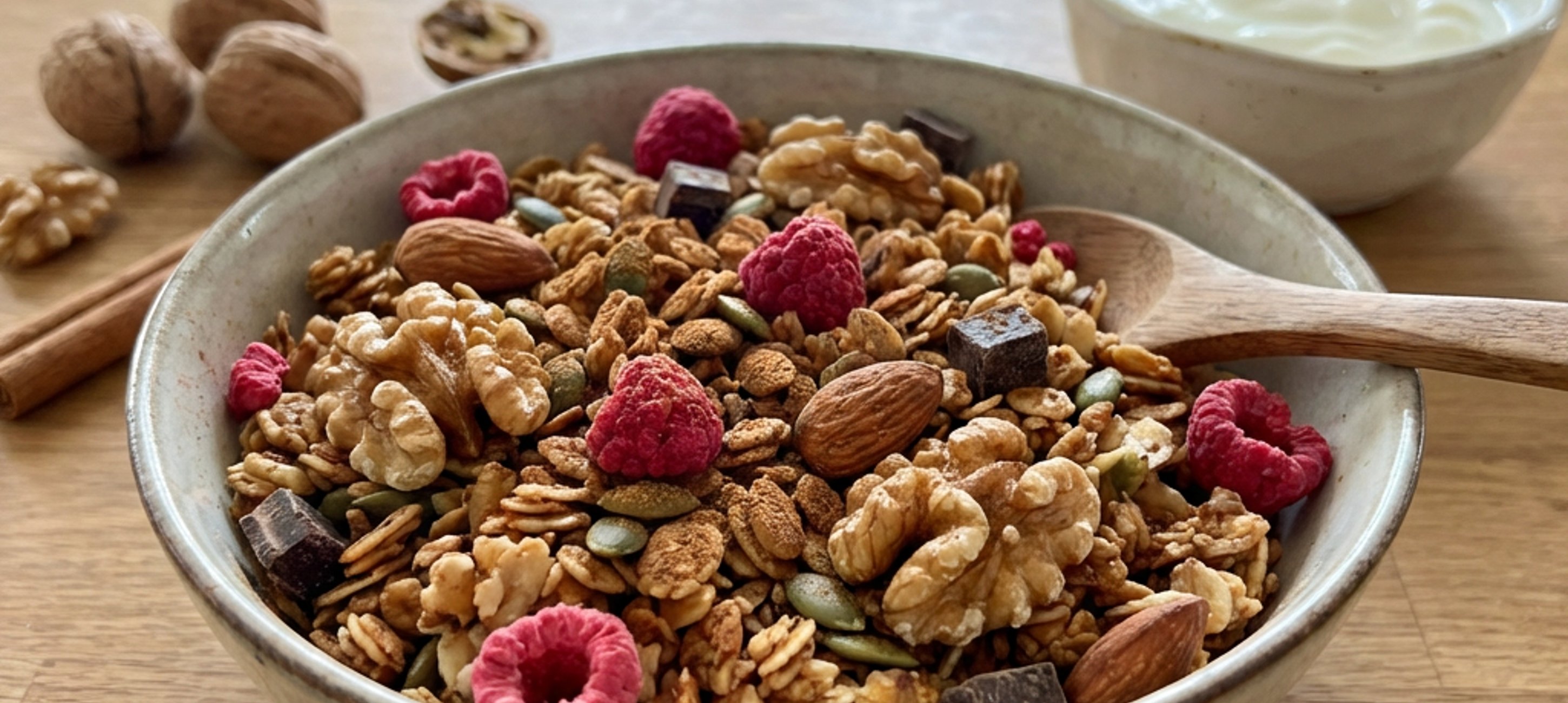 Hotovou granolu můžete podávat s bílým jogurtem nebo tvarohem.