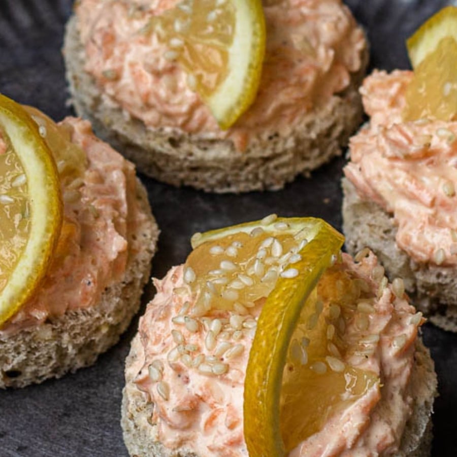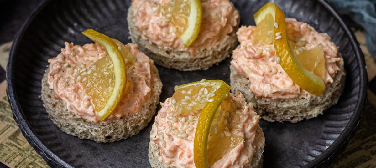 - 2Using a cutter, cut circles from the toast bread, spread the mixture on them, and garnish with sesame seeds and sliced lemon.