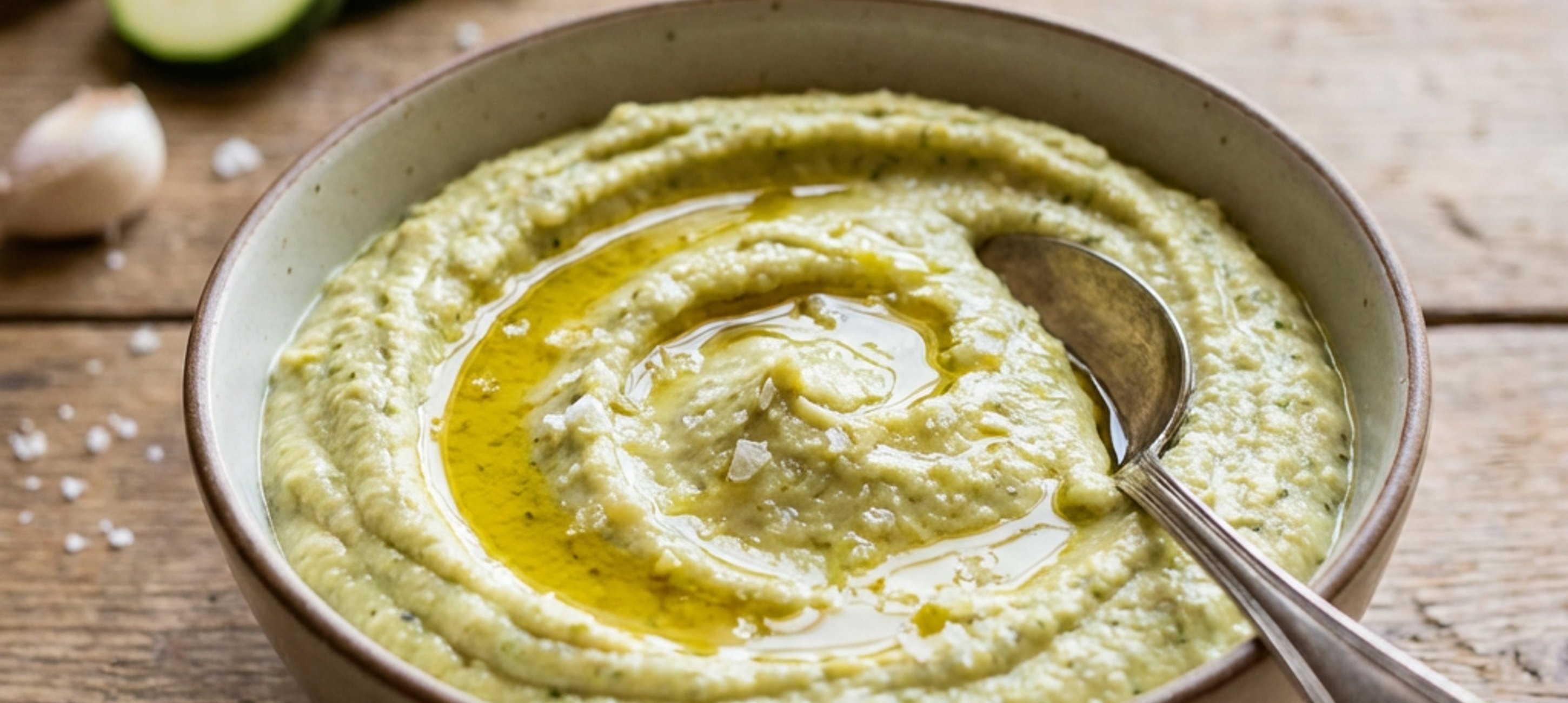 - 3Do vyšší nádoby vložíme hotovu cuketu, tahini, olivový olej, česnek a sůl. Mixujeme tyčovým mixérem dohladka a můžeme podávat.