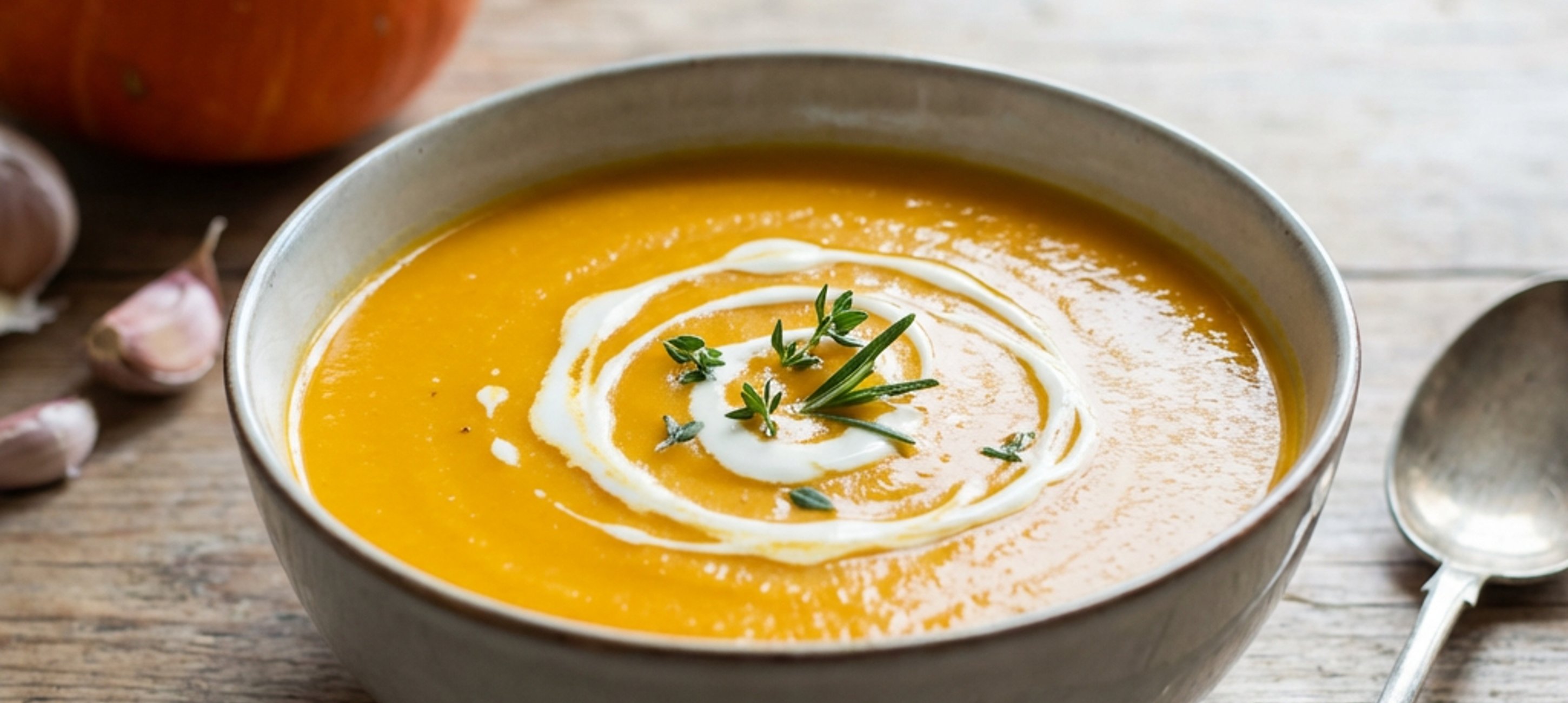 - 3Z upečené dýně odstraníme bylinky, česnek vymáčkneme ze slupky a rozmixujeme ji s teplým zeleninovým vývarem. V hrnci přivedeme dýňový krém k varu, vypneme a již bez vaření do polévky zamícháme sladkou smetanu, dokořeníme strouhaným muškátovým oříškem, solí a pepřem.