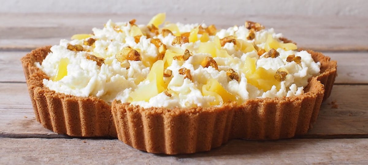 - 1Whip the ricotta for about 2 minutes with the coconut and sifted sugar, add the cream and whip until the cream thickens. Fill the cream into a piping bag with a decorating tip (e.g., Wilton 1M) and pipe it onto the pre-baked crust.
