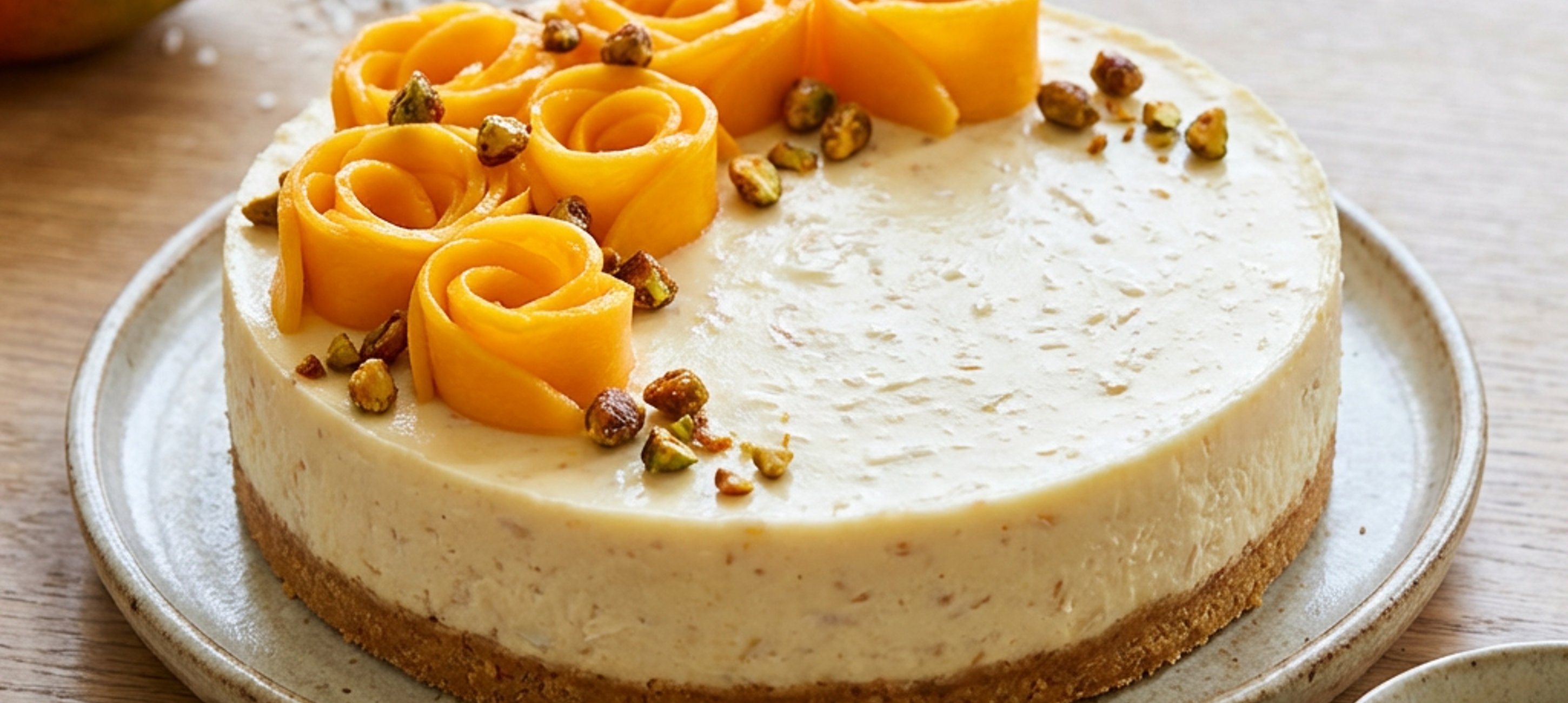 - 3Mango oloupeme, zbavíme pecky a nakrájíme z něj tenké plátky (použila jsem škrabku na brambory). Plátky smotáme do ruliček a ozdobíme jimi koláč. Posypeme nasekanými karamelizovanými pistáciemi.