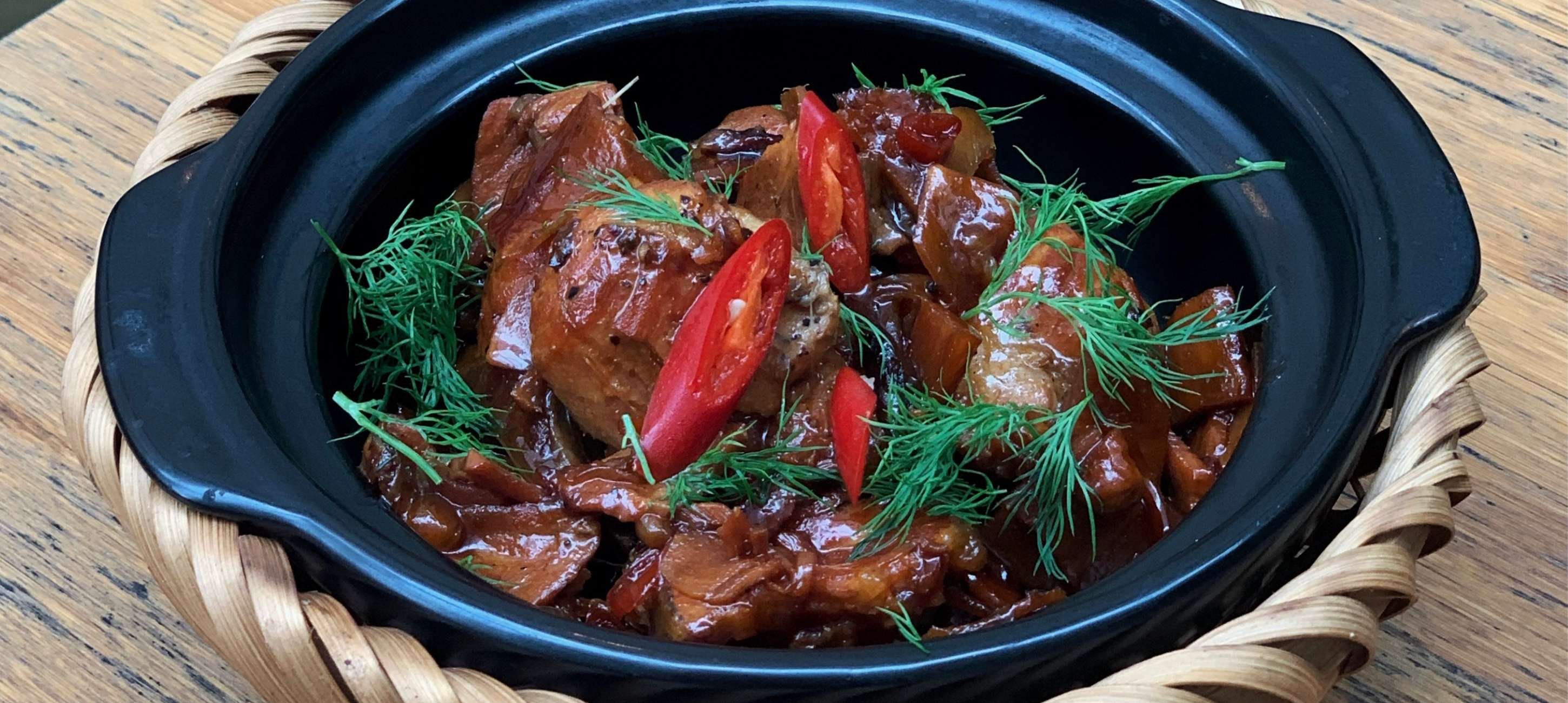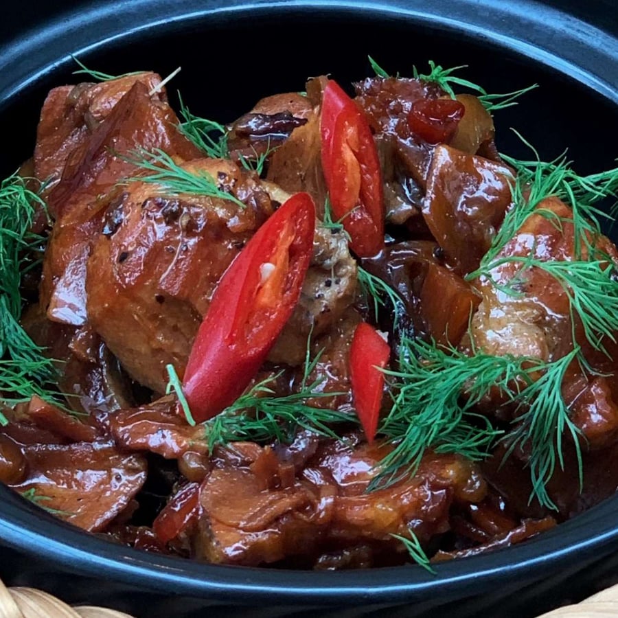 - 3Place the fish in the pot, add the shallots, ginger or galangal, lime leaves, and chili. Add the fish sauce, caramelized sugar, pour in hot water, and cover with a lid. Cook on low heat for about 30 – 40 minutes until the water reduces to a creamy sauce.