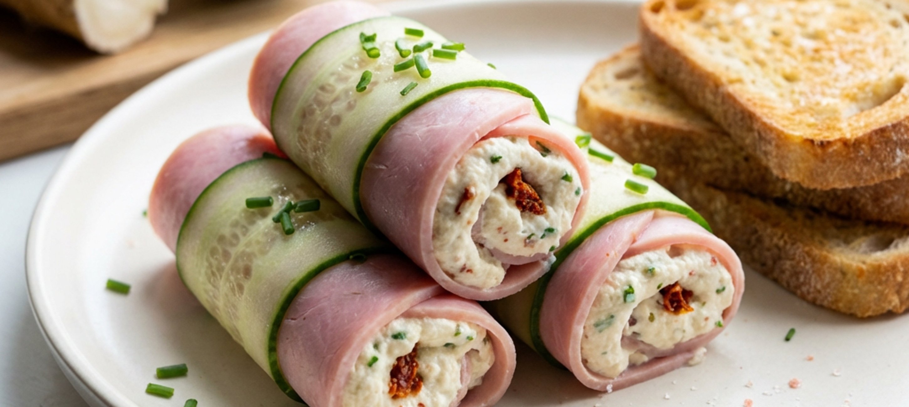 - 2Na každý plátek šunky natřeme slabší vrstvu ochucené pěny a zabalíme do rolky. Nebo můžeme ze šunky umotal dutou rolku a naplnit cukrářským zdobícím sáčkem. Škrabkou na brambory seřízneme z okurky 6 tenkých plátků a každou rolku zabalíme.