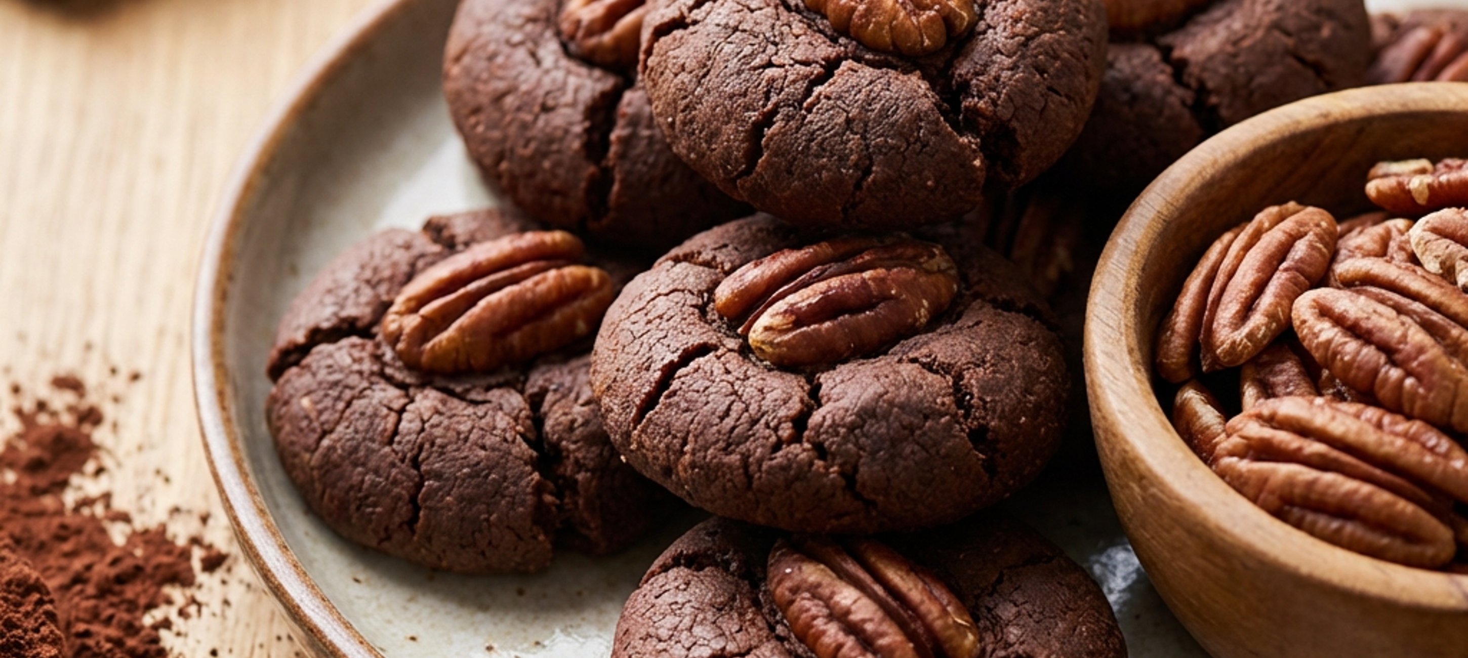 - 3Z těsta odebíráme 15 g kousky a tvoříme kuličky, které pokládáme na plech s pečícím papírem. Na každou kuličku položíme pekanový ořech a jemně přimáčkneme.