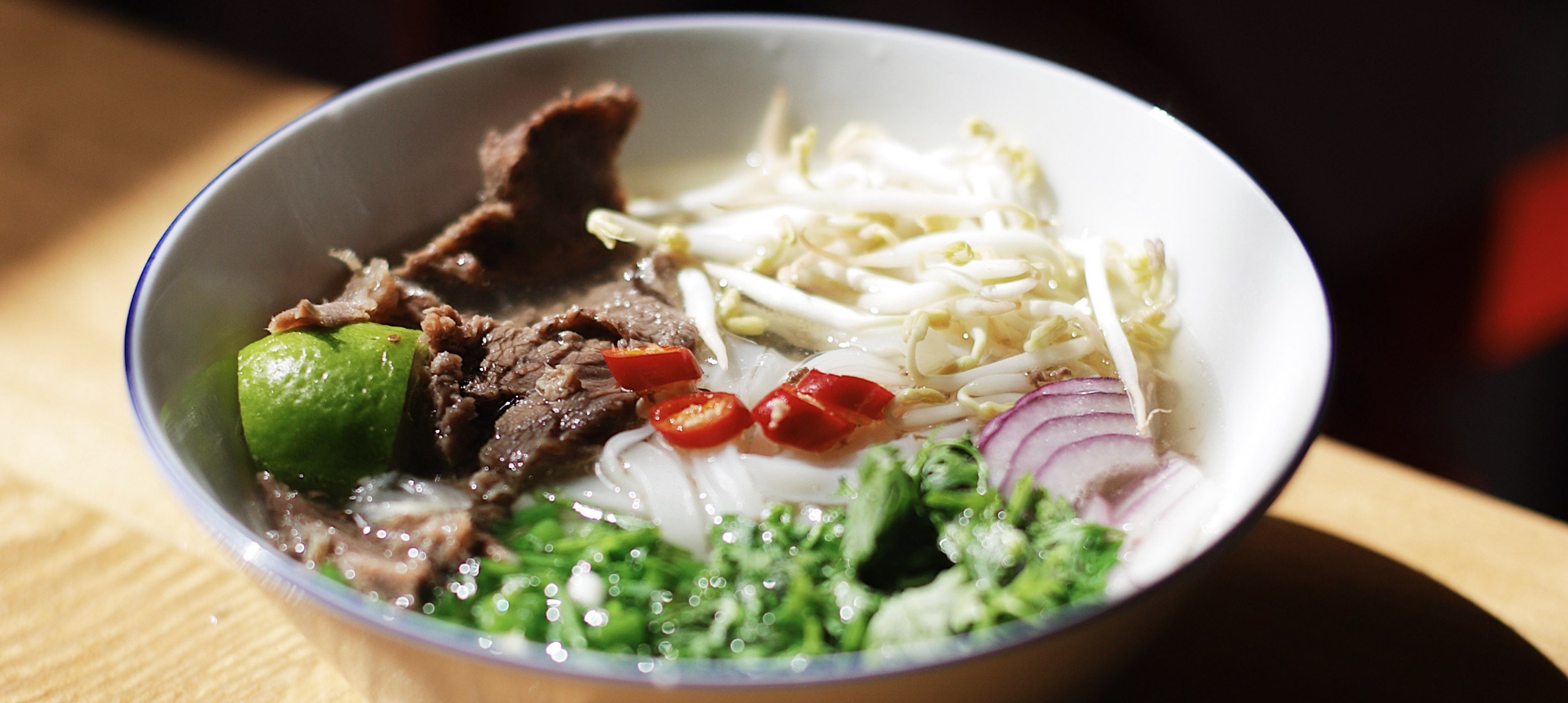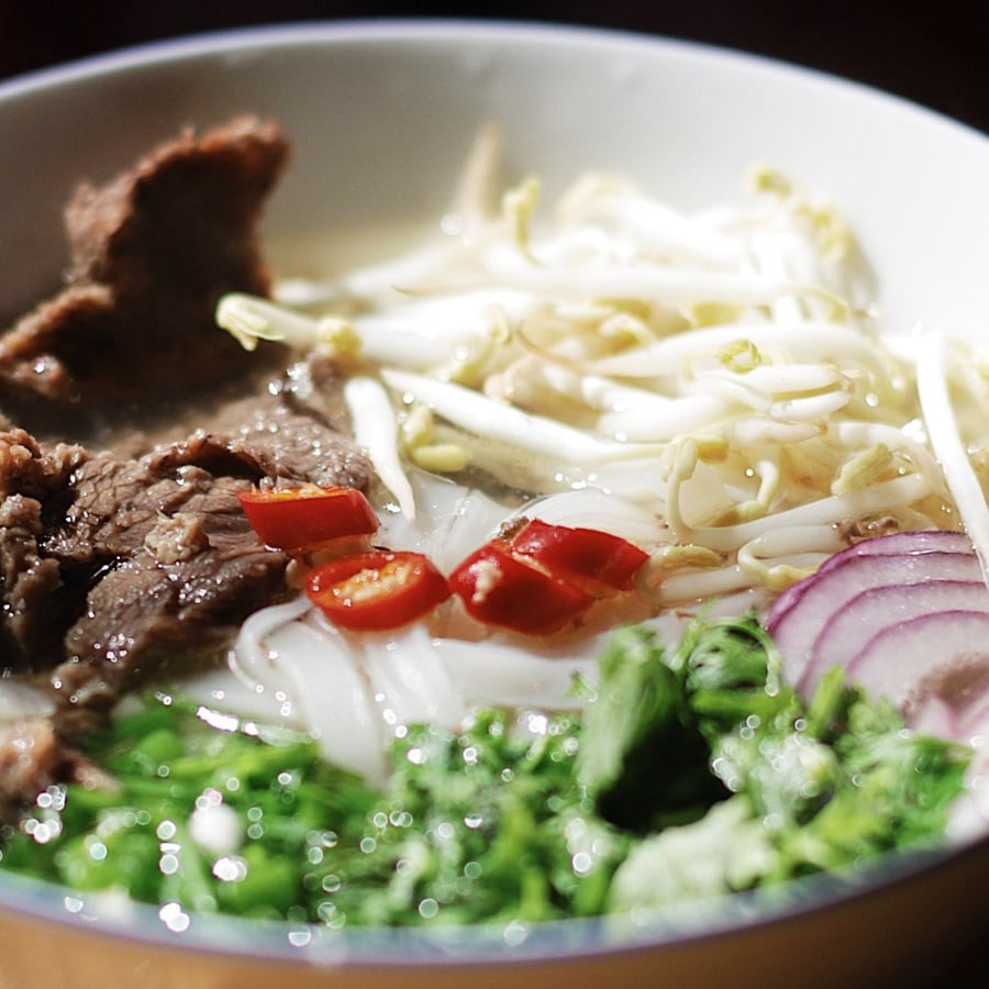 - 5Serve the noodles in a bowl, add sliced beef, spring onion, mung bean sprouts. Pour over with hot broth and serve immediately. Sprinkle the pho with coriander, chili, and drizzle with lime.