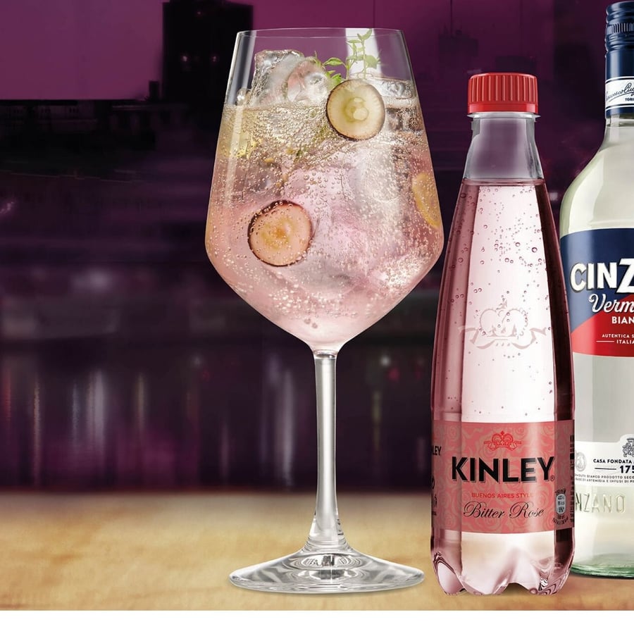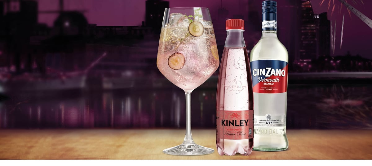 - 1Do sklenice dejte led, poté nalijte Kinley Bitter Rose a Cinzano Bianco.