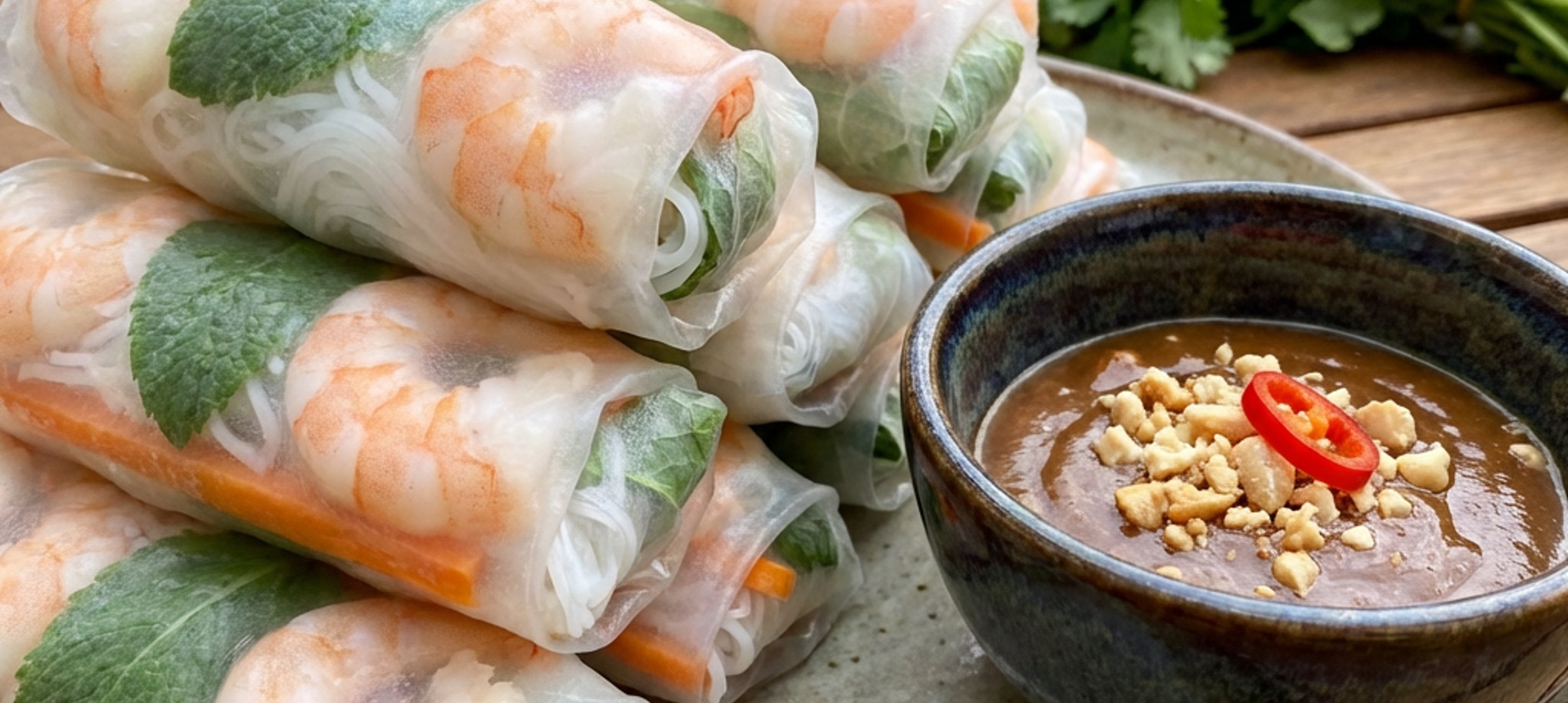 - 3Hotové závitky namáčíme v arašídové omáčce.