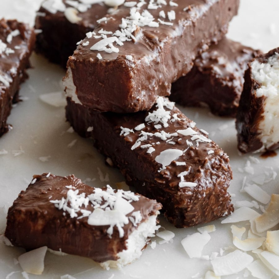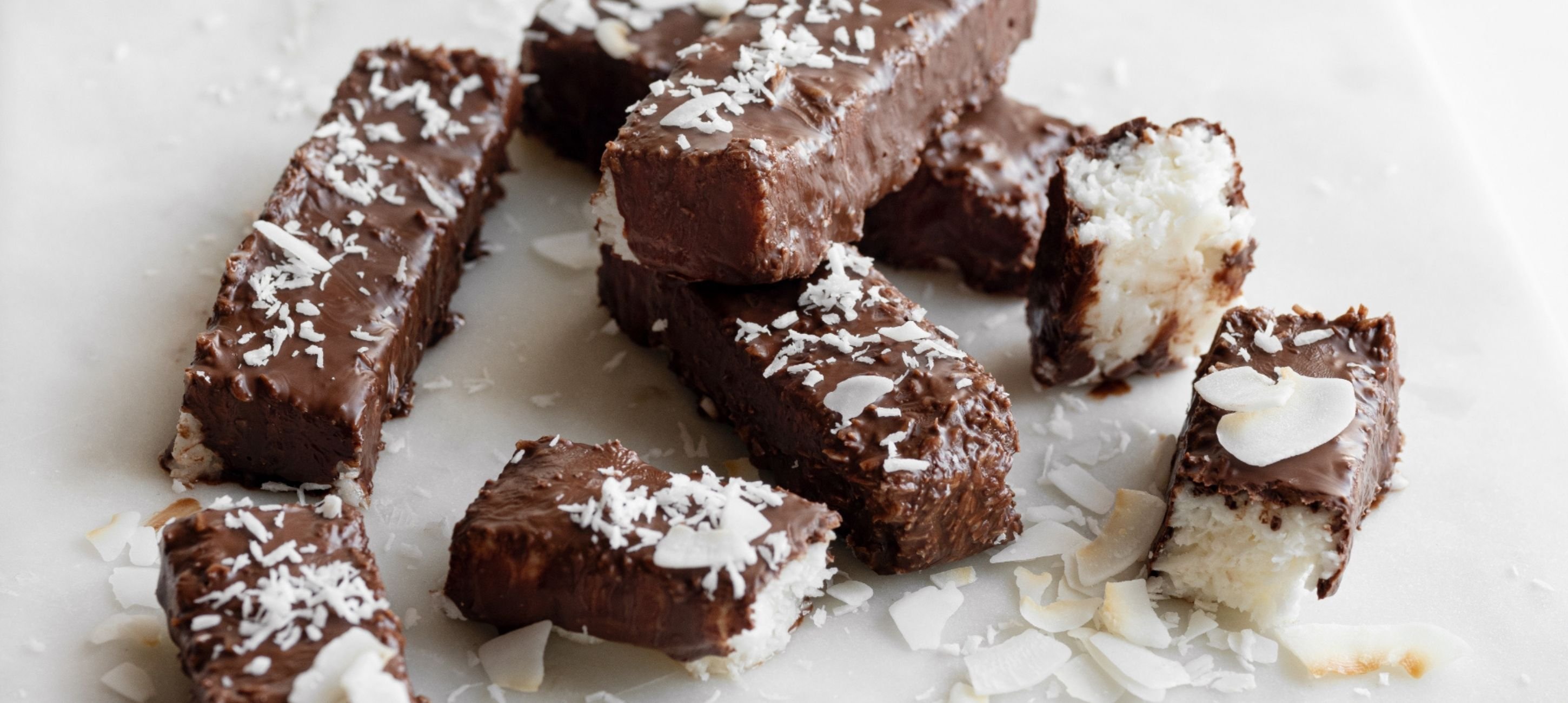 - 5Remove the container with the coconut mixture from the freezer and cut the mixture into rectangles (4 cm × 20 cm). Coat each piece in the melted chocolate and let it drip off (preferably on a baking rack). Then place the coated pieces in the refrigerator for 20 minutes.
