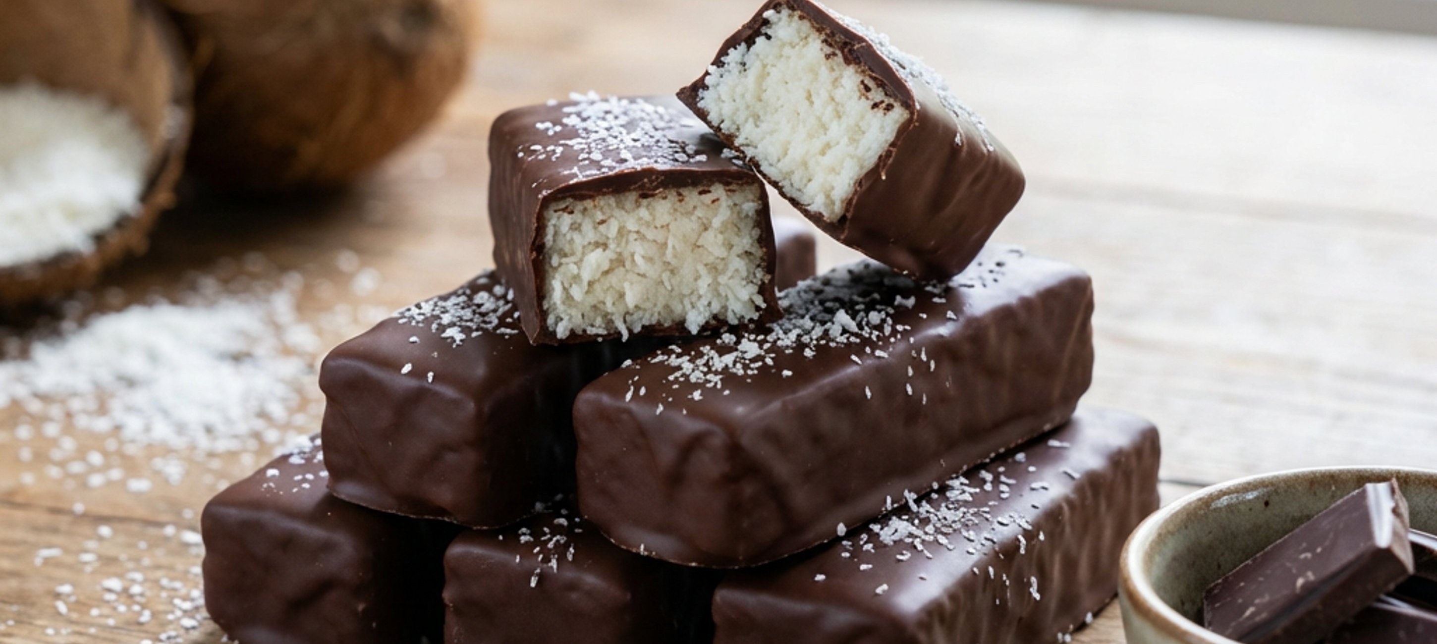 - 5Nádobu s kokosovou směsí vyjměte z mrazáku a směs nakrájejte na obdélníky (4 cm × 20 cm). Každý kousek obalte v rozpuštěné čokoládě a nechte okapat (nejlépe na pečicí mřížce). Obalené kousky následně vložte na 20 minut do lednice.