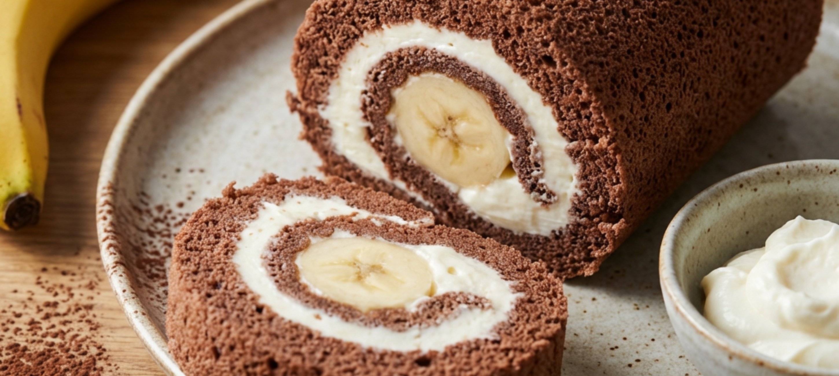 - 5Na vychladlý korpus naneste připravený krém a po okraji, od kterého začnete roládu rolovat, podélně rozmístěte oloupané banány a poté roládu opatrně srolujte. Takto připravenou roládu vložte alespoň na 2 hodiny do lednice.