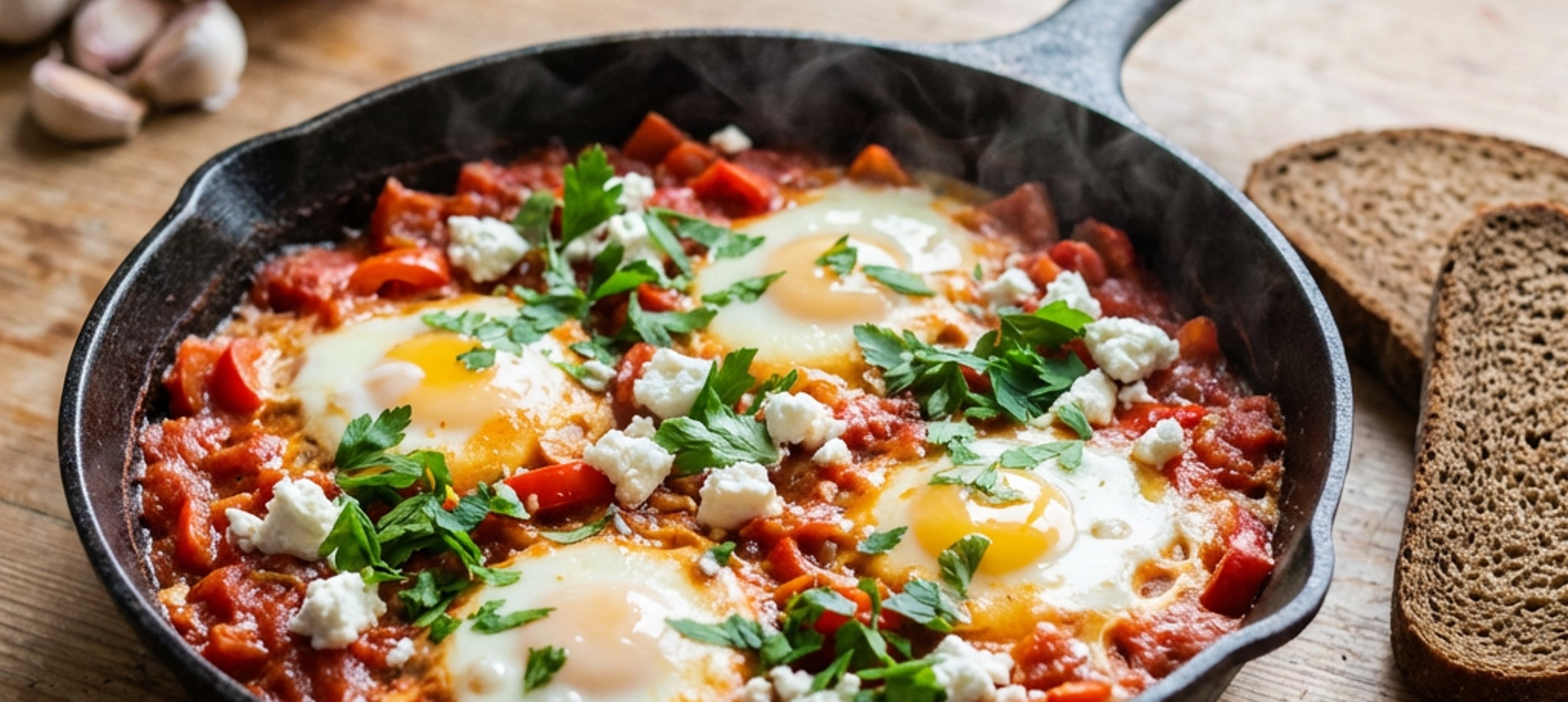 - 2Do omáčky poté udělejte důlky na vajíčko, rozklepněte do každého jedno vejce, zakryjte pokličkou a nechte péct asi 5 minut.