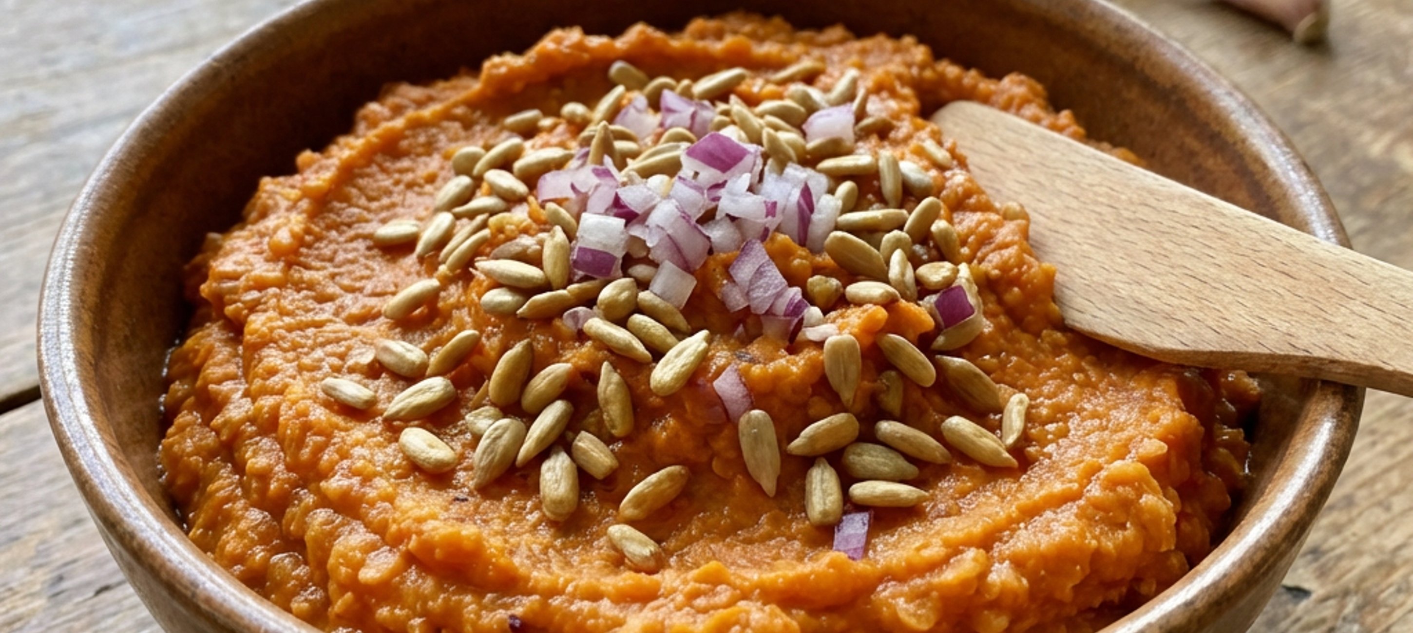 - 2Přidejte semínka, olej, šťávu z citronu, lisovaný stroužek česneku a oloupaný a nastrouhaný zázvor. Přidejte koření, pepře zhruba 2 otočení mlýnku. Rozmixujte tyčovým mixérem. Do rozmixované pomazánky přidejte najemno nakrájenou červenou cibuli.