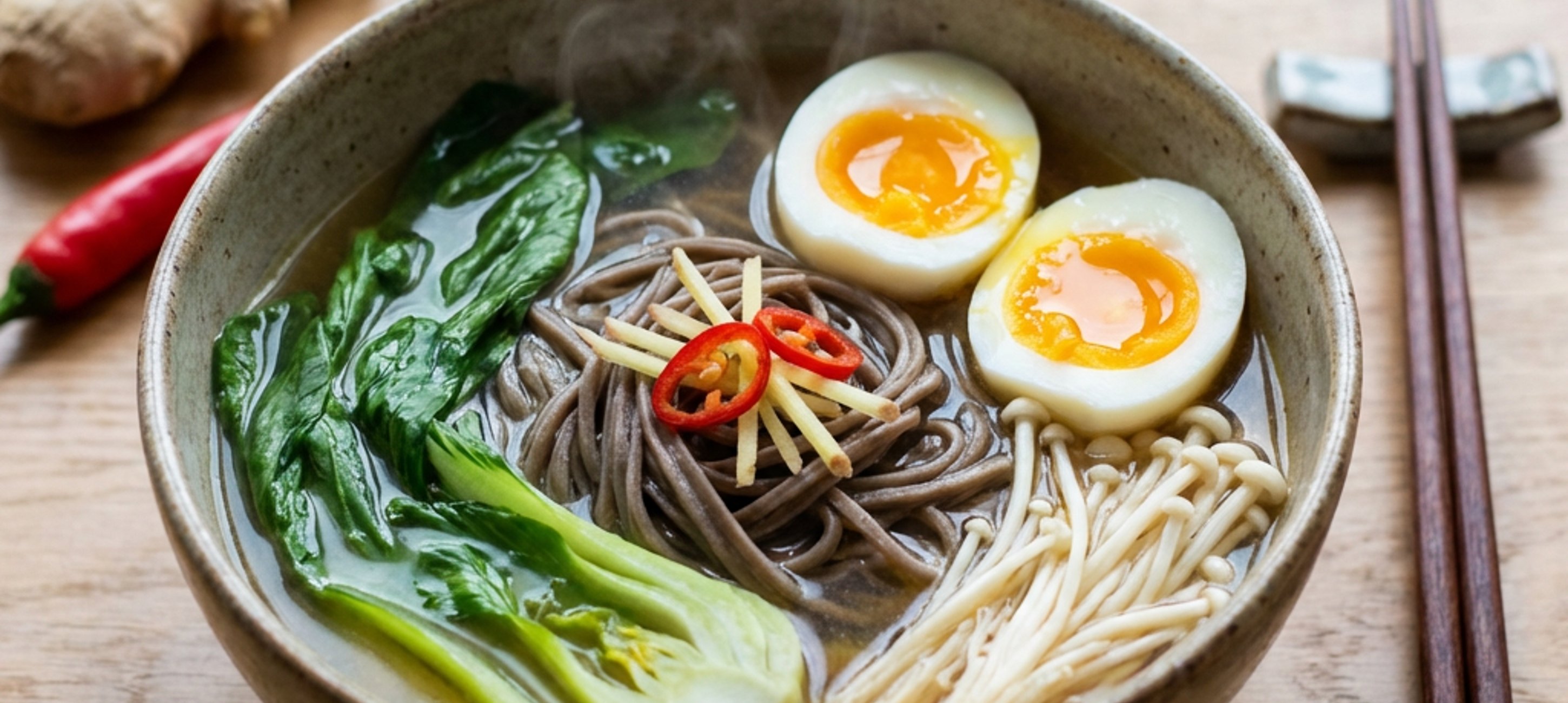 - 5Na vrch polévky pak rozdělte překrojená vejce a houby enoki. Na závěr můžete přidat i oblíbené bylinky nebo vločky chilli.
