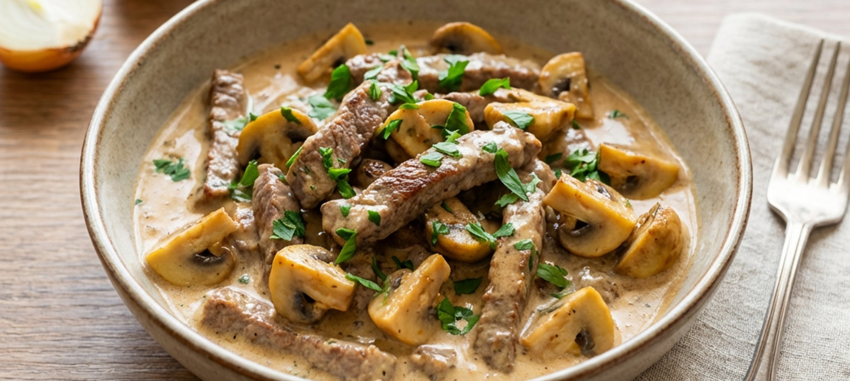 - 5Maso vyjměte stranou k opečeným houbám a cibuli. Pánev vraťte na plotýnku a vlijte do ní 100 ml vody (nebo lépe vývaru) a nechte téměř všechnu prudce odpařit, tím se uvolní přípečky ze dna pánve. Vmíchejte smetanu a vypněte plotýnku. Jakmile se smetana prohřeje, vraťte do pánve její původní obsah a promíchejte. Zakryjte a nechte 5 minut stát někde stranou, ale už nevařte. Podávejte například s rýží, zasypané zelenou petrželkou pro živější barvu.