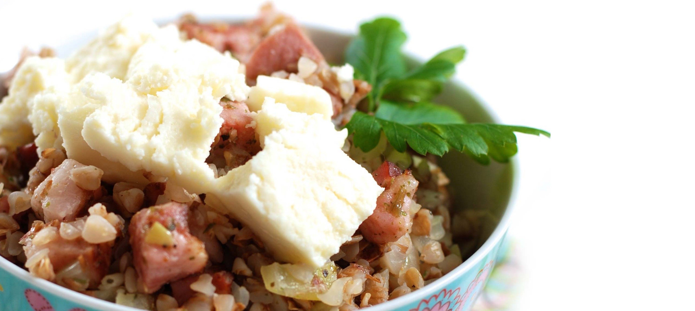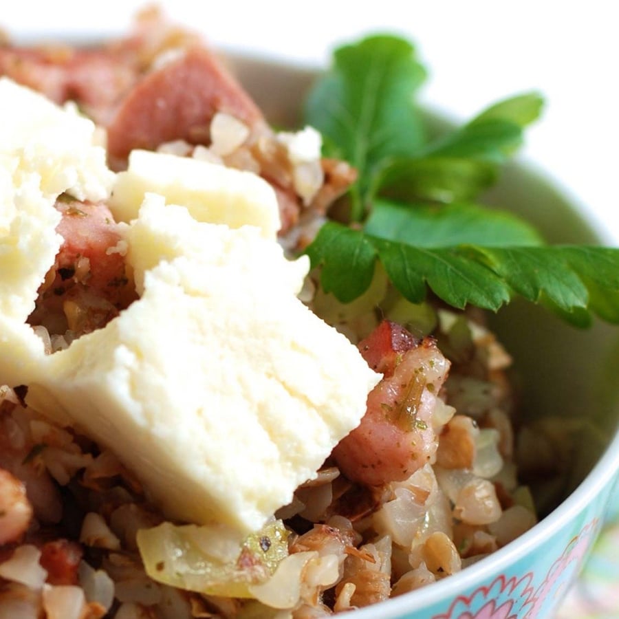 - 3Stir the cooked buckwheat into the meat-onion mixture. Divide into bowls, sprinkle with bryndza, and optionally, do not skimp on fresh herbs.
