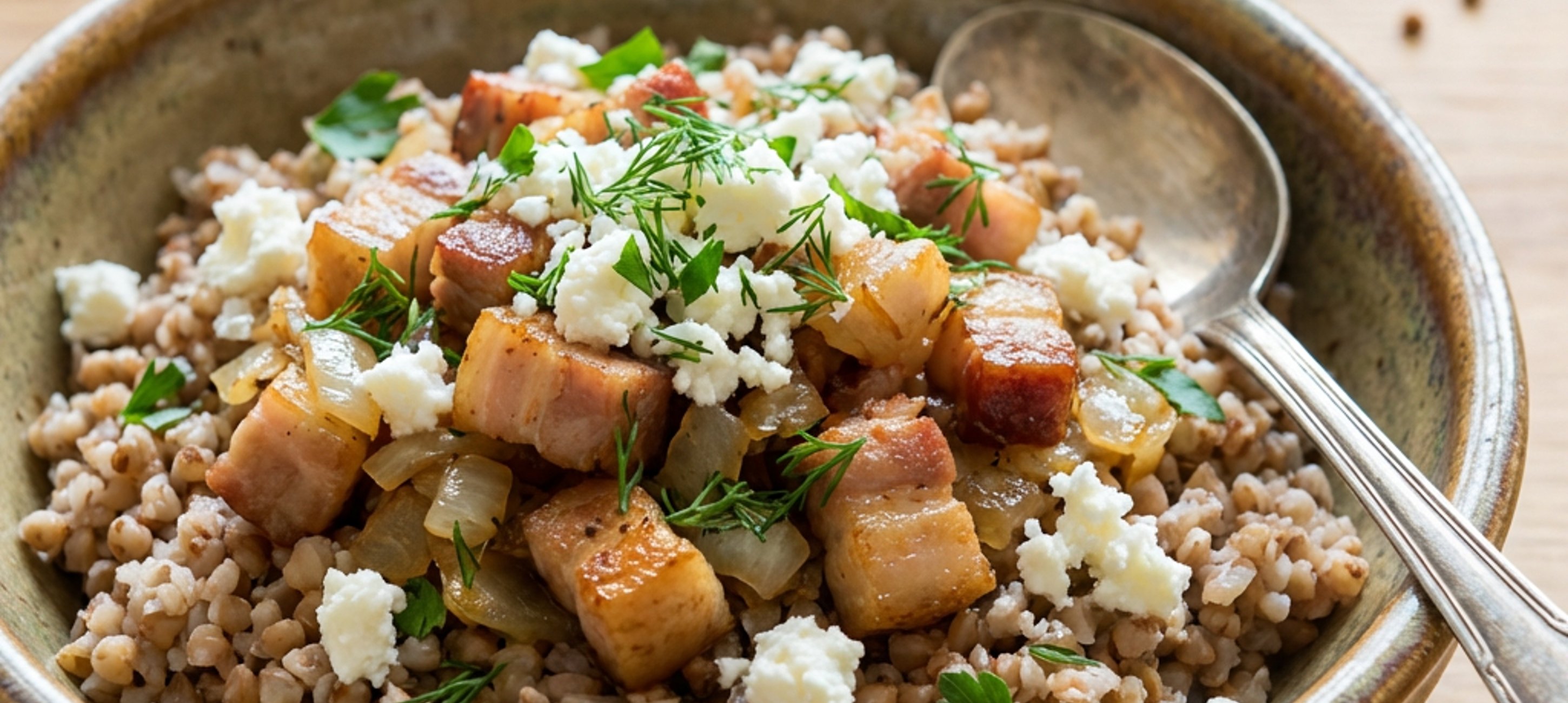 - 3Do masovo-cibulové směsi vmíchejte uvařenou pohanku. Rozdělte do misek, posypte brynzou, případně nešetřete čerstvými bylinkami.
