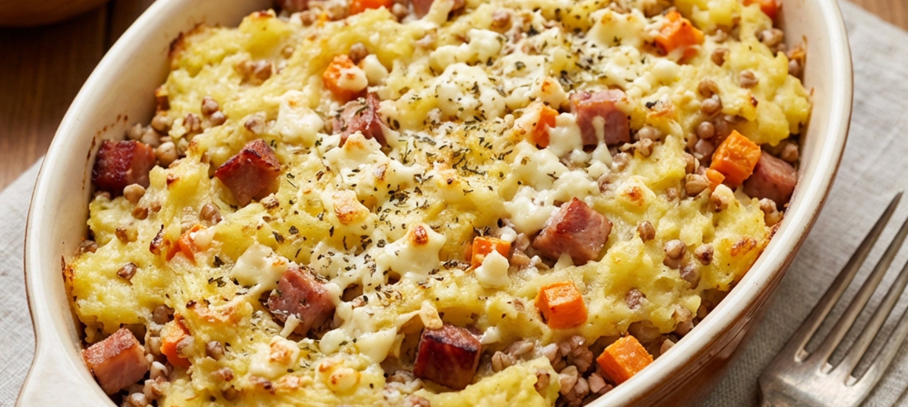- 4Uvařenou mrkev vyjměte a nakrájejte na kostičky, přidejte k uzenému masu. Brambory slijte a rozšťouchejte nahrubo. Společně smíchejte dušenou pohanku, směs s uzeným masem, šťouchané brambory, a směs nasypte do pekáčku. Posypte rozdrobenou brynzou nebo strouhaným sýrem, vložte do horké trouby a pečte 20 minut do zezlátnutí.