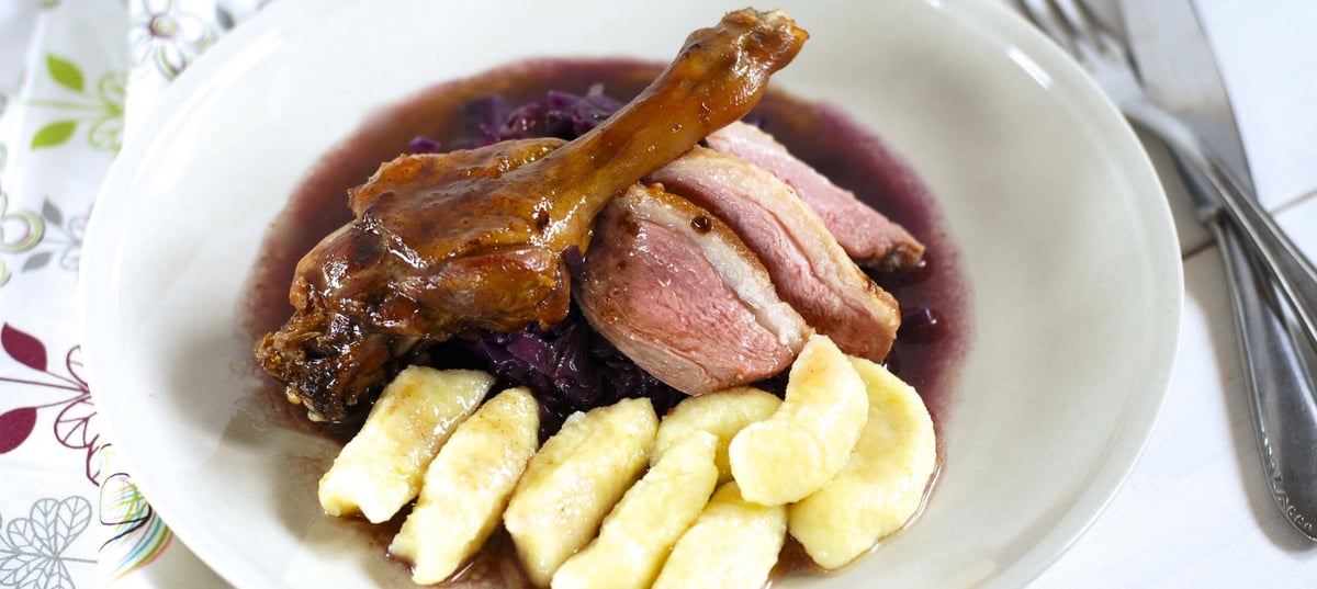 - 8Metličkou rozmíchejte propařenou mouku v kastrůlku tak, aby ve šťávě nezůstaly žádné žmolky. Kachnu libovolně naporcujte (jde to bez většího násilí, maso se rozpadává), přelévejte zahuštěnou šťávou a podávejte s knedlíkem a zelím vaší volby.