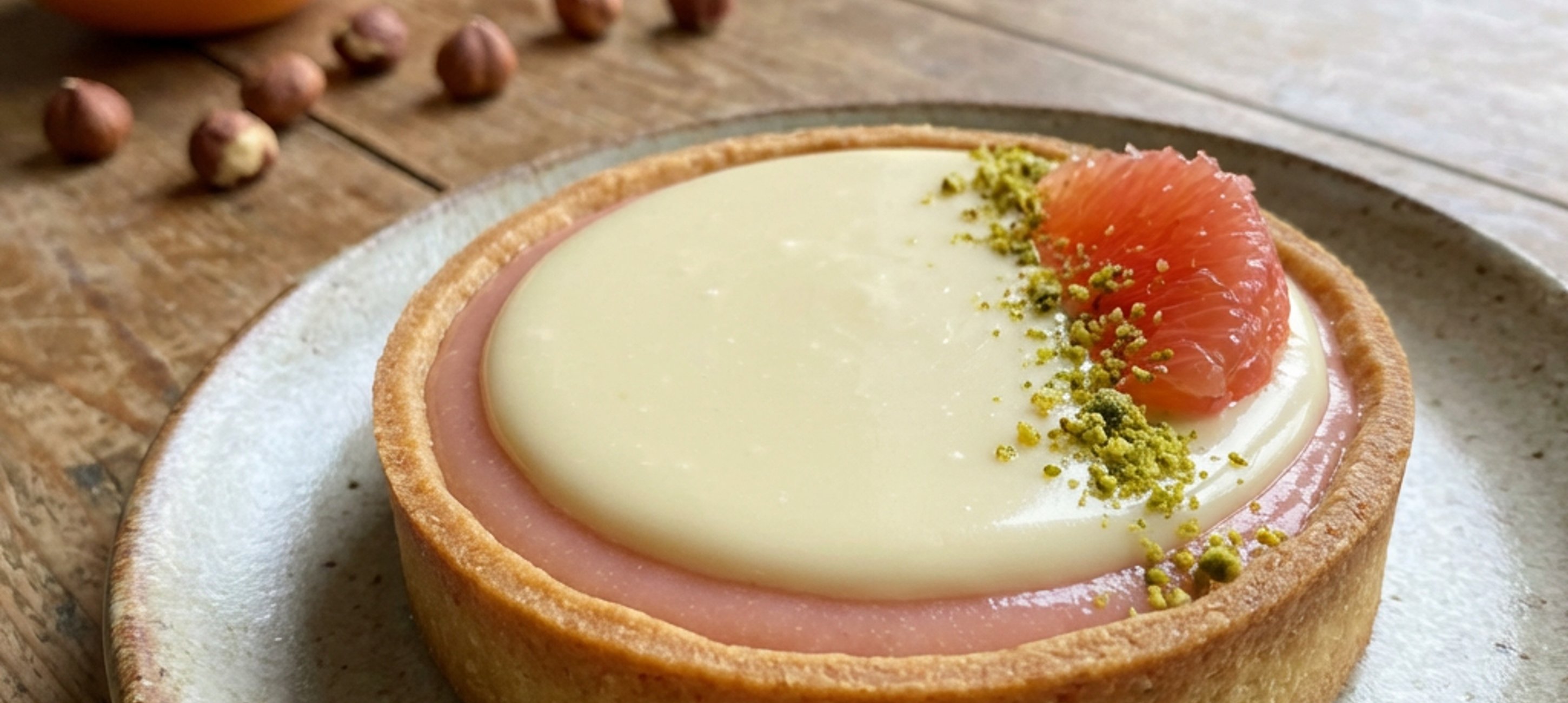 - 1Na dno tartaletek naneste nejprve grepový žloutkový krém a následně nalijte grepovou ganache do roviny s krajem tartaletky.
