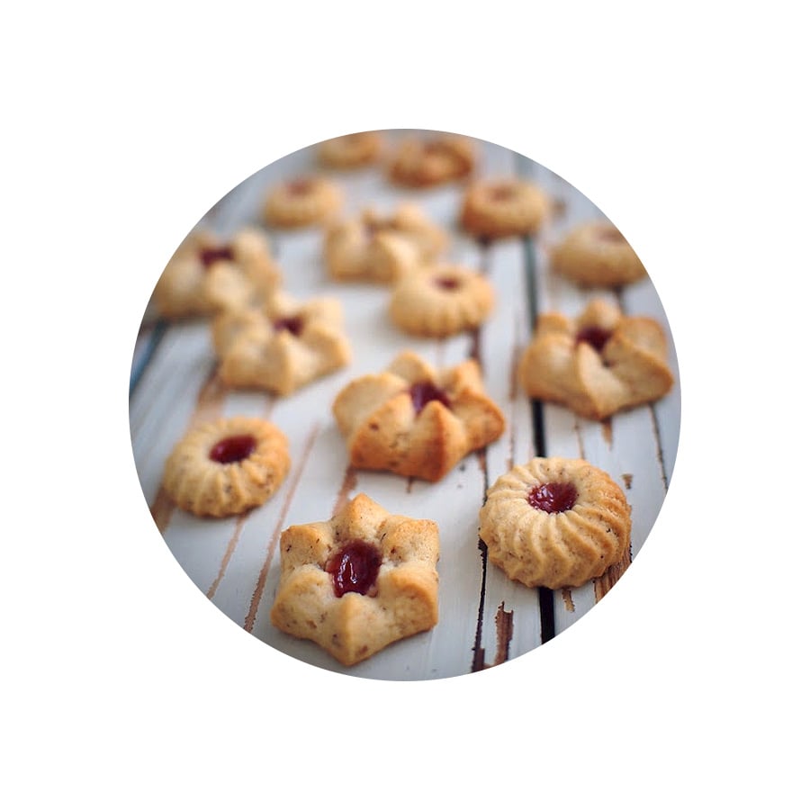 - 2Cukrářský sáček se zdobicí špičkou (např. řezaná hvězda 1M) naplníme těstem a na plech vyložený pečicím papírem stříkame malé kytičky. Silnější špejlí nebo hůlkou na jídlo uděláme do středu každé kytičky důlek. Igelitový sáček naplníme marmeládou, ustřihneme špičku a důlky naplníme. Takto připravené sušenky vložíme na 3 hodiny do ledničky nebo na 20 minut do mrazničky.