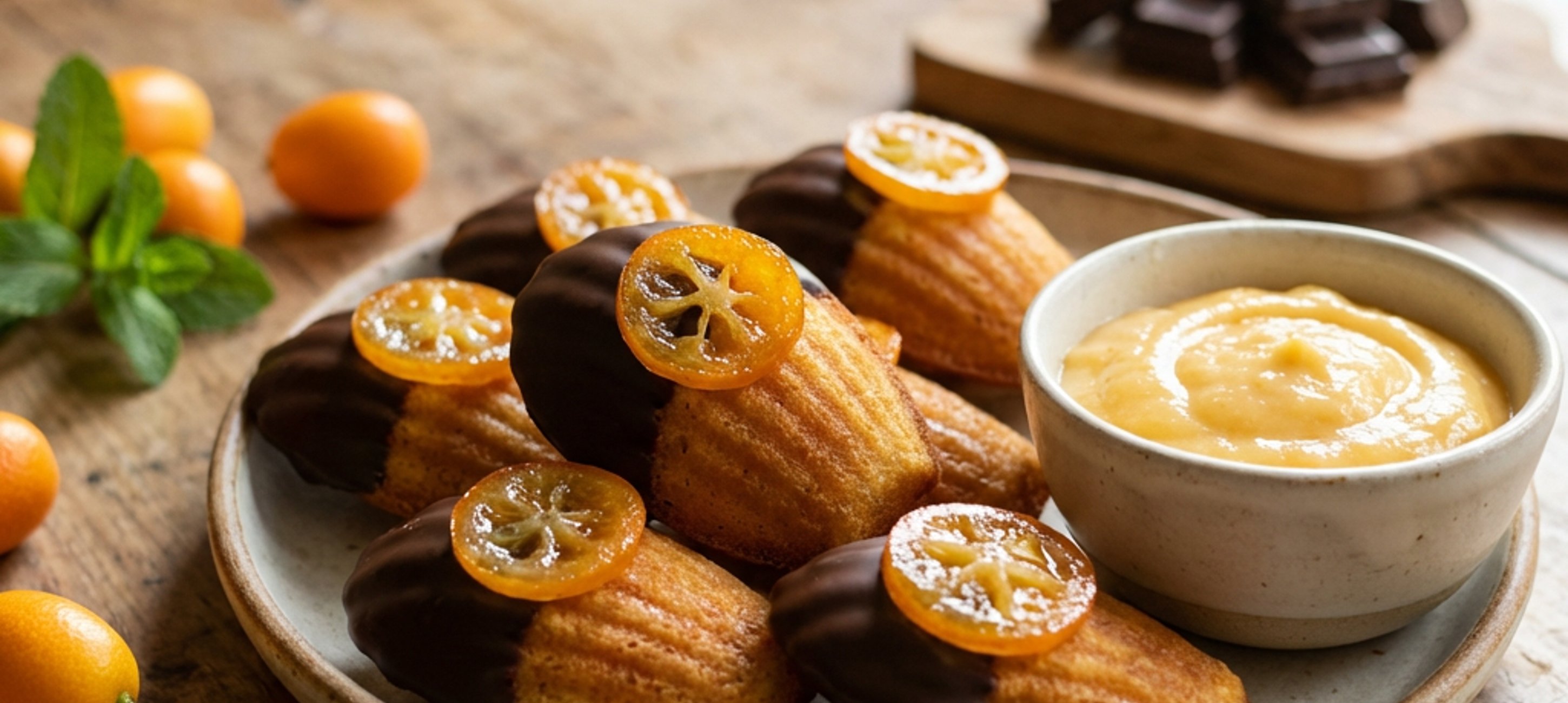 - 2Naplněné madlenky polomáčejte v čokoládové polevě a po zatuhnutí polevy nalepte glazovaný kumquat (pokud byste jej položili na tekutou polevu, nasákl by kumquat čokoládu a zhnědl by a ztratil oranžový lesk).