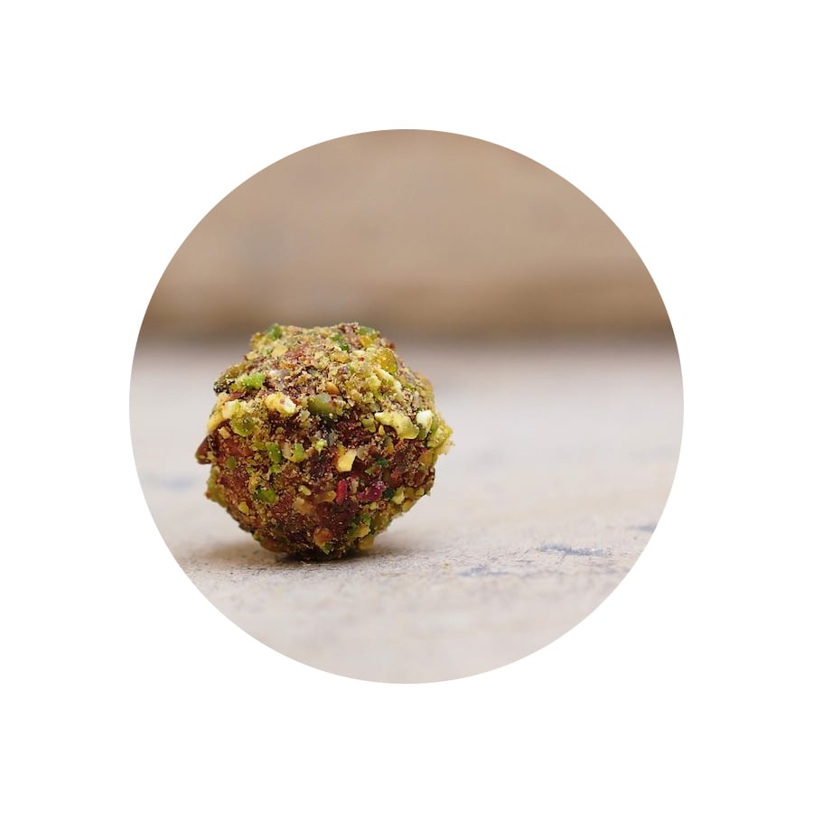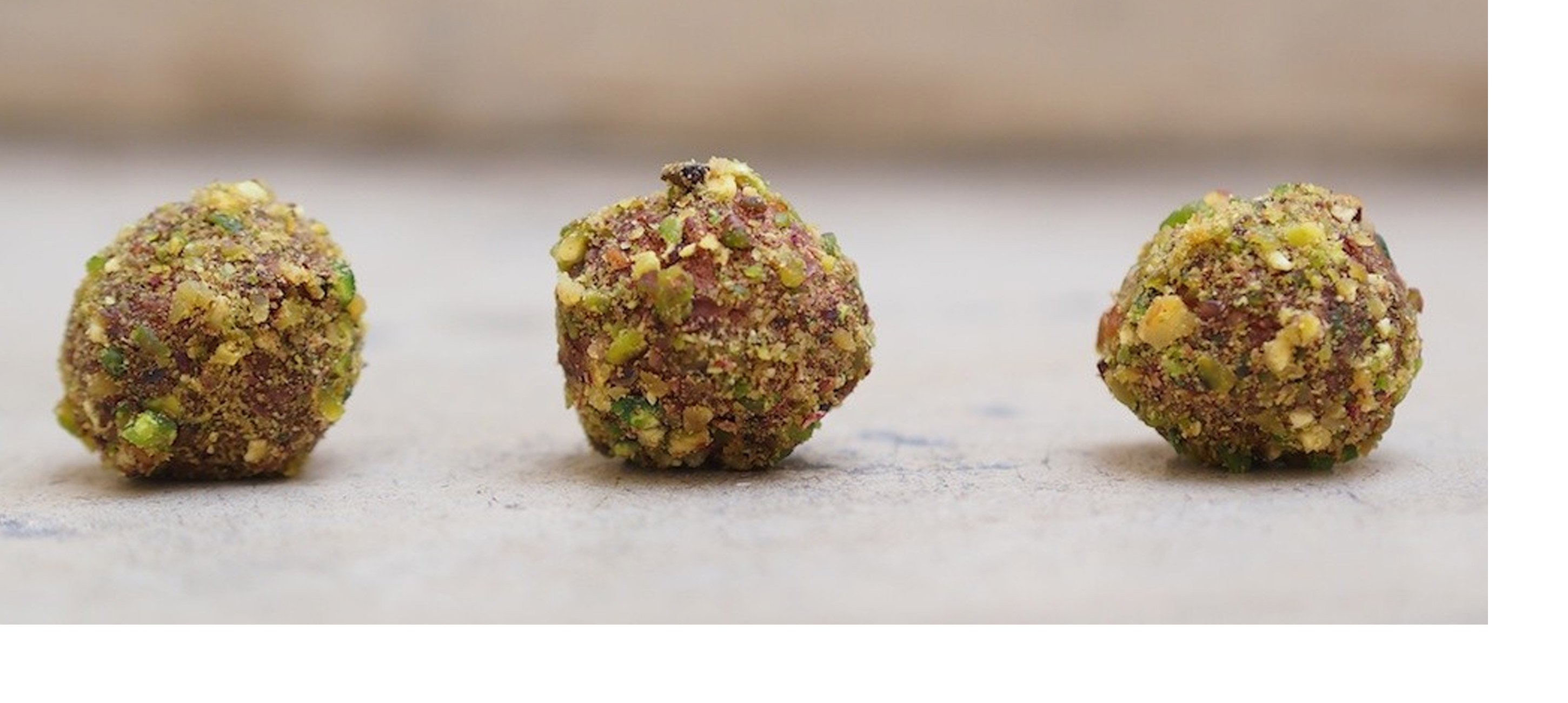 - 2Chop or grind the pistachios into smaller pieces. Use a teaspoon to scoop pieces from the solidified mixture, shape them into balls, and immediately coat them in pistachios. The balls are easier to shape in hands slightly moistened with cold water.