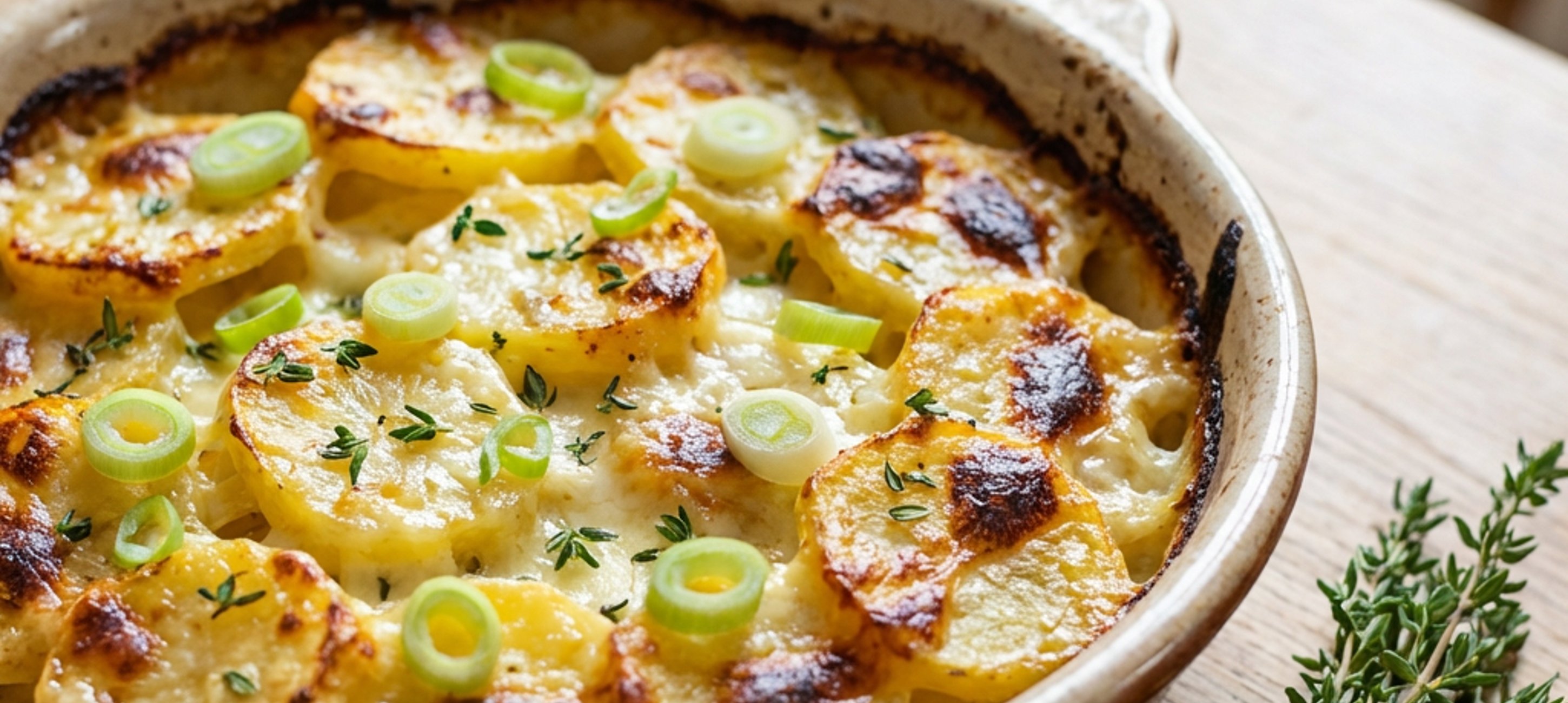 - 2Jarní cibulku nakrájíme na kolečka. Zapékací misku vymažeme máslem. Vyskládáme první vrstvu brambor. Osolíme, opepříme, přidáme špetku muškátového oříšku, část nakrájené jarní cibulky a lísky tymiánu. Vyskládáme další vrstvu brambor. Postup opakujeme, dokud nemáme spotřebovány všechny brambory.