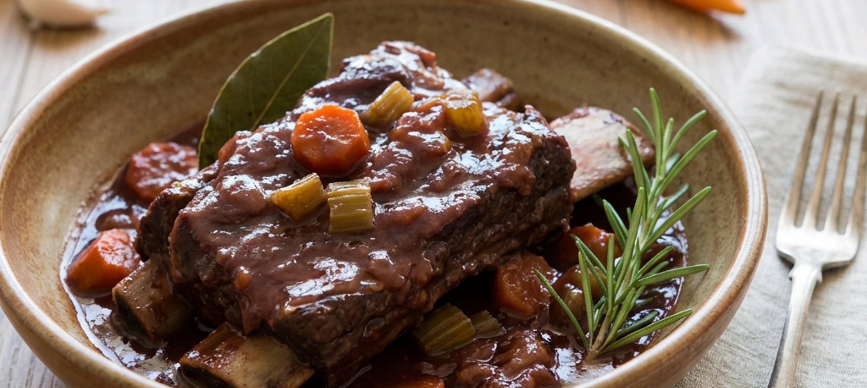 - 3Když už z pánve necítíte stoupající alkohol, přidejte vývar, rajčata z plechovky a nakonec osmahnutá žebra. Dochuťte solí a pepřem.