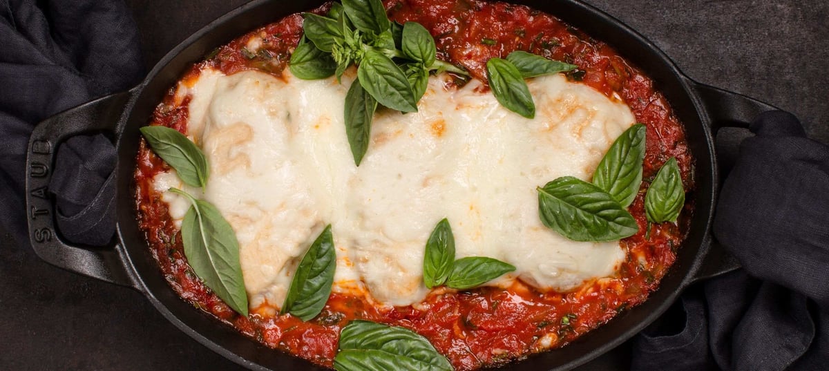 - 3Return the seared chicken breasts to the pan, pour over the prepared tomato sauce, and top with mozzarella. Cover the pan with a lid and let it cook on medium heat until done (about 3–4 minutes). Serve with the cooked pasta.