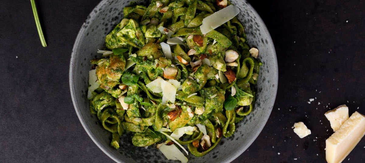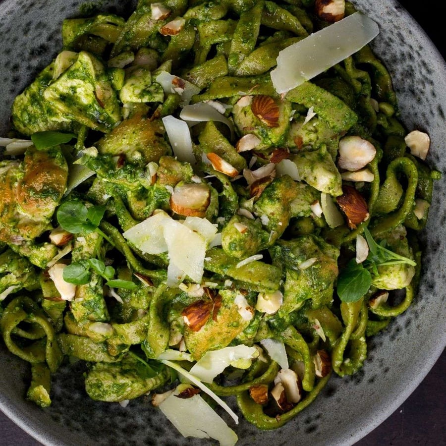 - 3Prepare the spinach pesto: blend the spinach, hazelnuts, the remaining sunflower oil, and Parmesan together. Blend the pesto until smooth and season with salt and pepper.